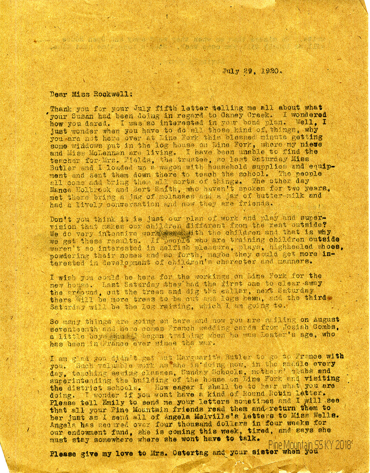 009-010 July 29, 1920. Two-page letter to “Miss (Mary) Rockwell” from KP (Katherine Pettit), who thanks Mary for her July 5th letter ‘telling me all about what your Susan had been doing in regard to Caney Creek.” Pettit expresses her wish that Mary could be at Line Fork, getting windows for the log house “where my niece and Miss (Isabel) McLennan are living.” Mrs. Fields, the trustee, still needs a teacher; she and Miss Butler took her a wagon-load of supplies. Mentions gifts that community folks, including Nance Holbrook and Bert Smith, brought for the school.