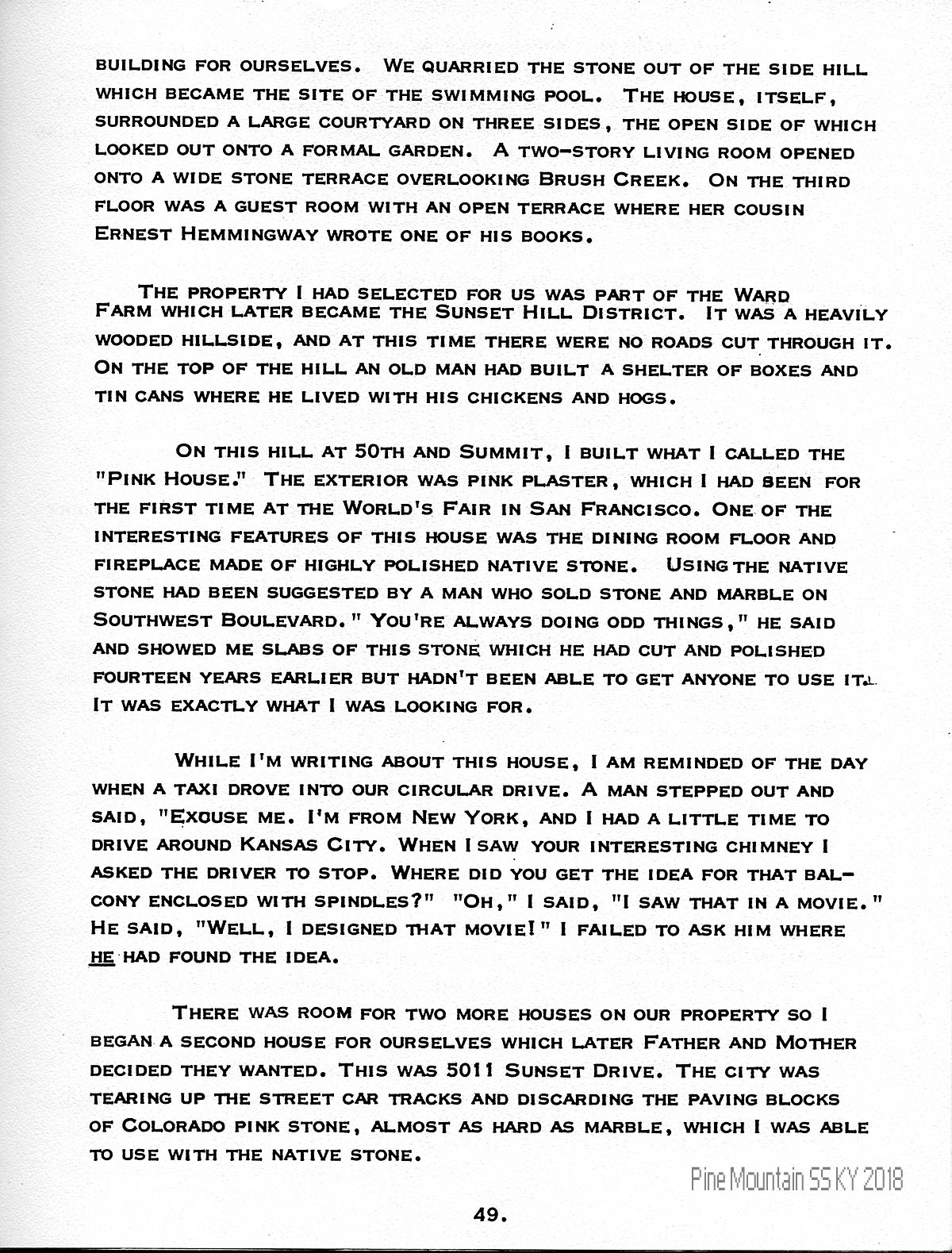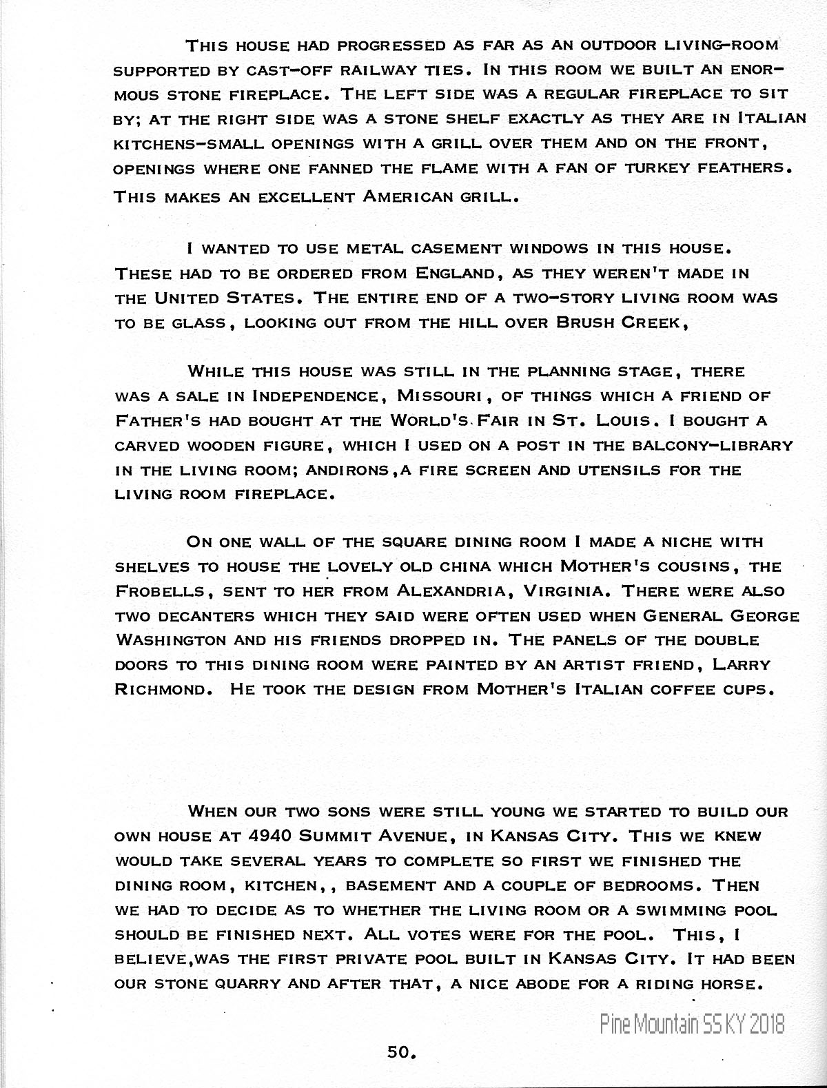 At Pine Mountain, her vision was, without a doubt, the most harmonious. Not only did her view include her forest garden, but also a view of the School that she had designed and placed in the middle of Eden … well at least, Paradise… Her architectural eye frequently mingled with her eye for landscape’s natural architecture. Further, she frequently invited Pine Mountain Students to spend a summer in Kansas City to work in landscaping, construction, childcare, an other jobs that instilled in them an even greater appreciation for sharing their native talents to improve the land, it’s bounty, and the education to sustain life. To bring the familiar love of the land of the Kentucky students to new geographies worked well. They came from Kentucky for Summer work as well as more permanent positions following graduation. Their work and later jobs borrowed from their native skills and many of the disciplined elements that were nurtured at Pine Mountain Settlement in their work-study programs.
