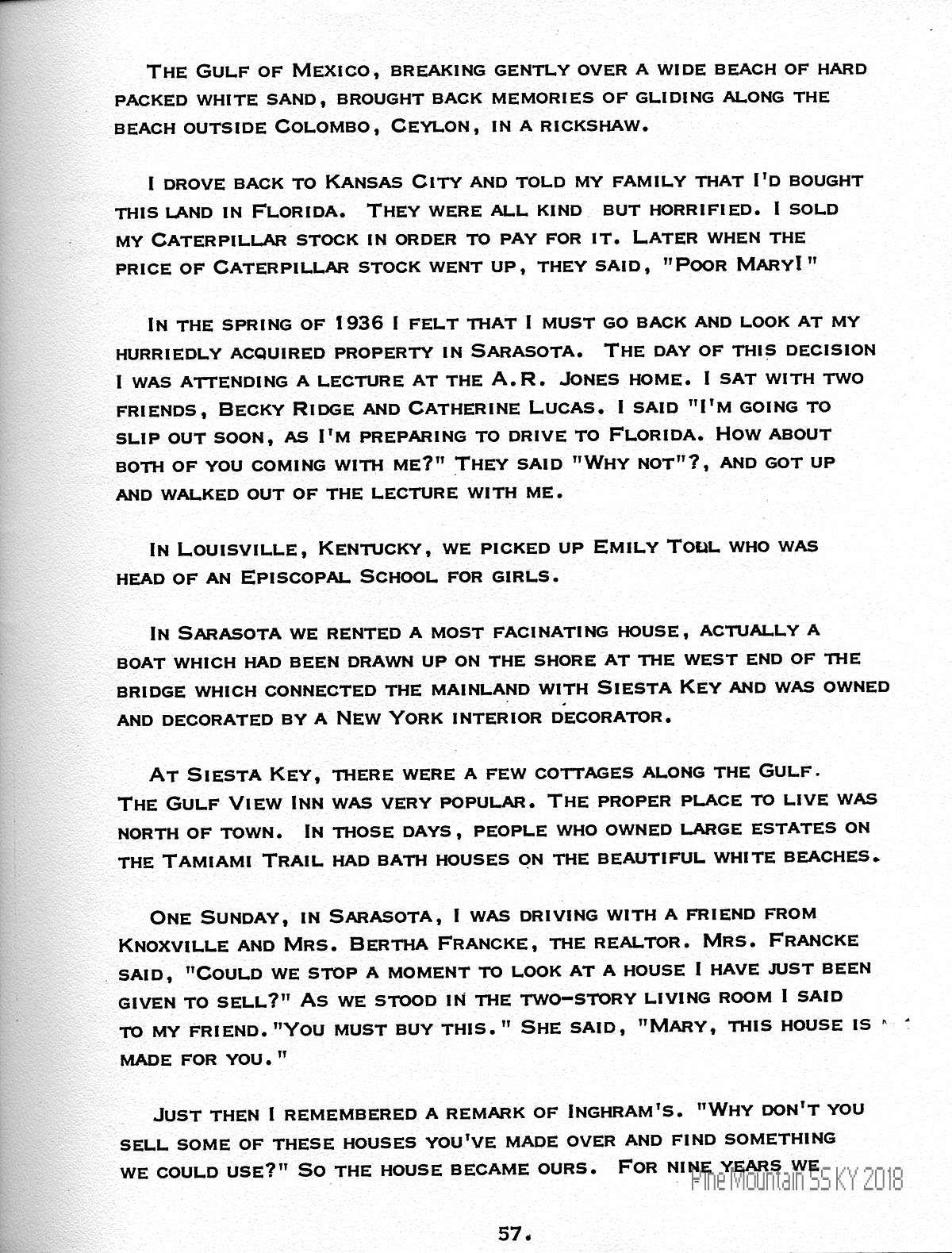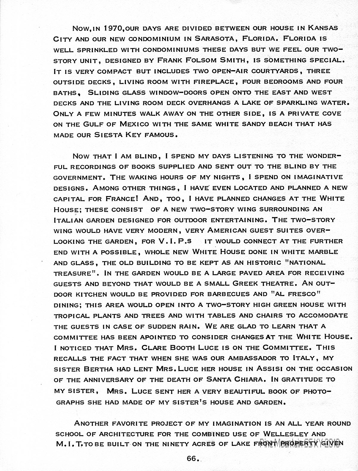 In many ways, these imaginative designs were Mary’s contributions to a “shining city on the hill” where nurture and nature could come together. She always imagined her houses with gardens and places where the dweller could live a life in harmony with the natural outside world. One of her last visions was a new contemporary town in western Kansas, where she was born. She imagined that it would share “a park complete with prairie dogs and tumbleweed.” In the town of her birth, Junction City, Kansas, she “designed” another park which she imagined to be filled “with sunflowers and various wildflowers.” Many of her homes were surrounded by marvelous gardens and views. At the end of her life, the Florida Siesta Key home was her “White House” —low to the earth with sweeping views and gardens, and gardens — where she loved to entertain her friends and guests.