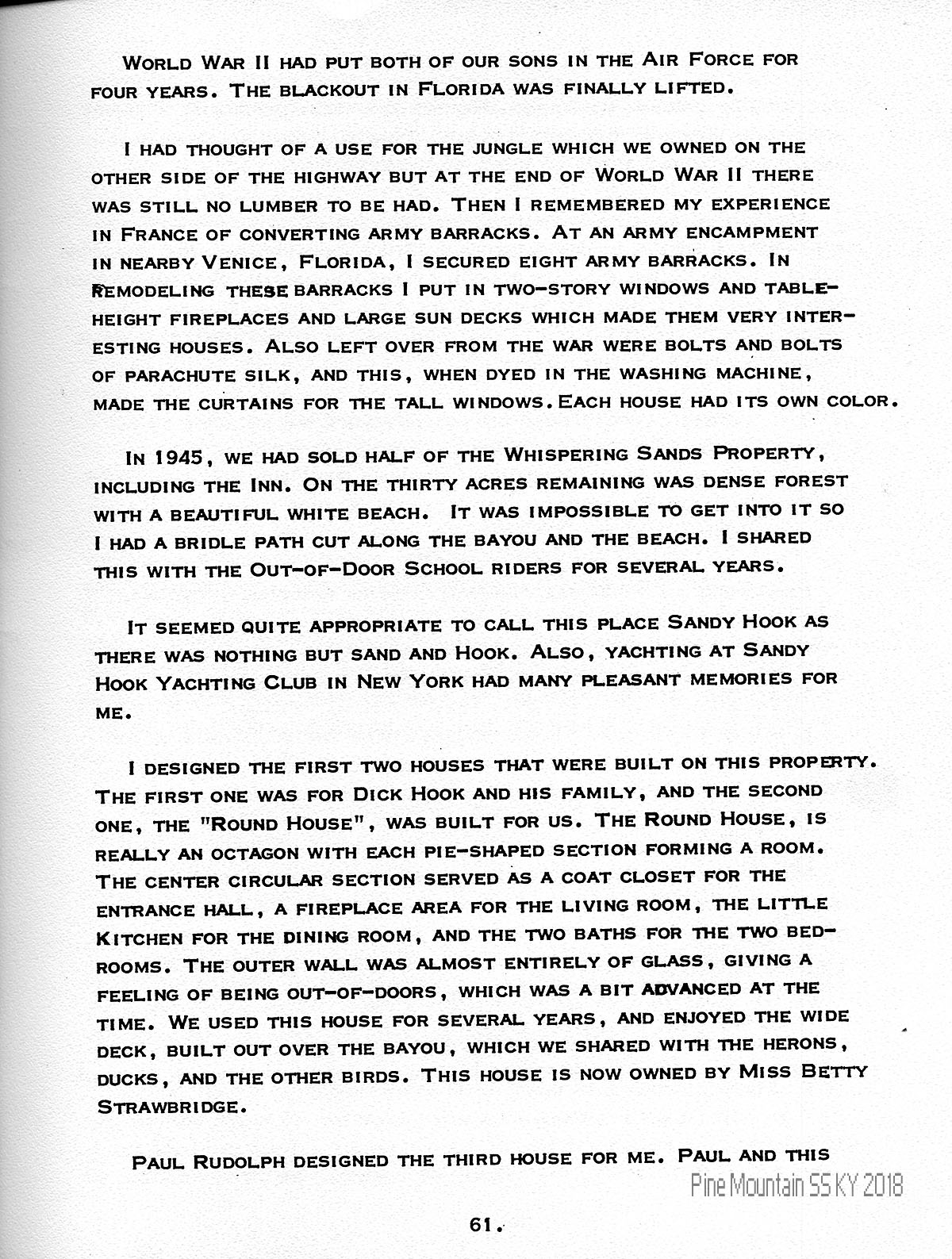 It is little wonder that Mary Rockwell Hook continued to come to Pine Mountain as long as her frail body could manage it. There, in the deep mountains of Kentucky, her Open House was surrounded by the most natural of gardens. The mossy slopes, and boulders topped with trillium, and ferns, rhododendron, and laurel mixed with azaleas tumbling in lush bouquets outside her doors, — enough to satisfy even the most persnickety gardener. Her architectural vision was consistently a house that was inside out, where she could look out on the forest or garden or ocean.
