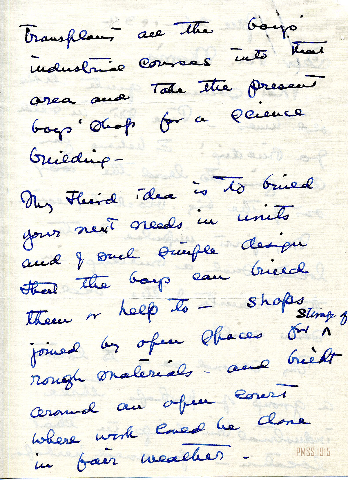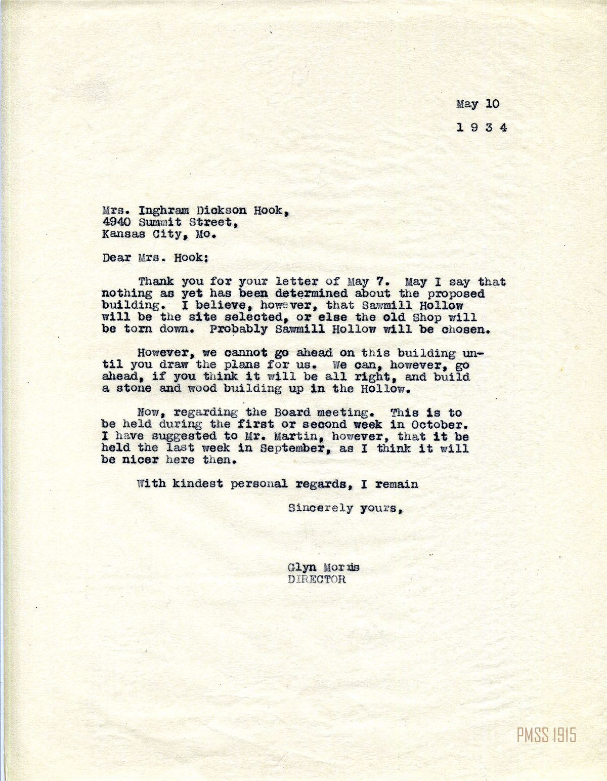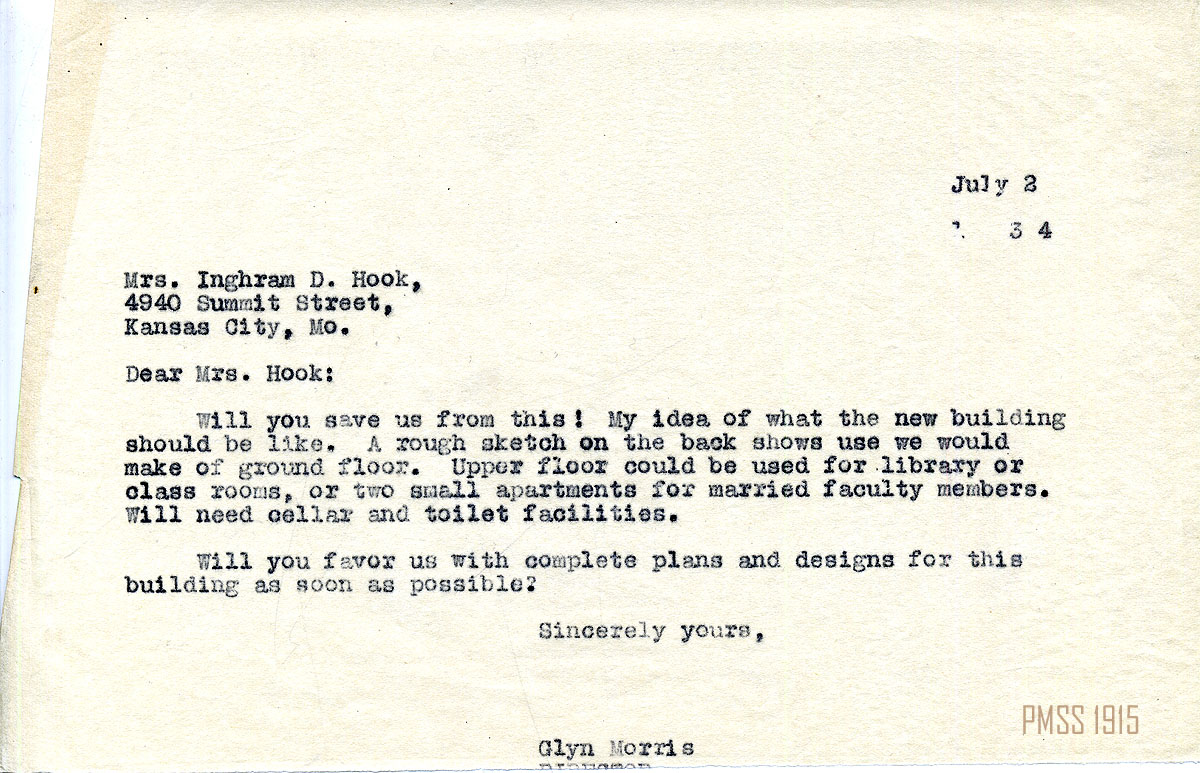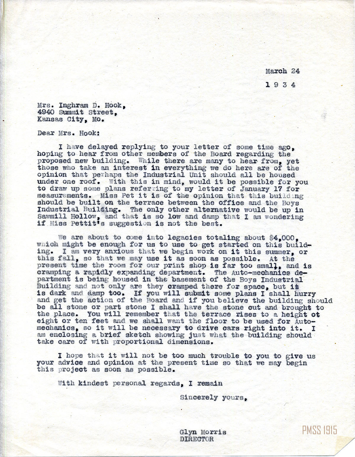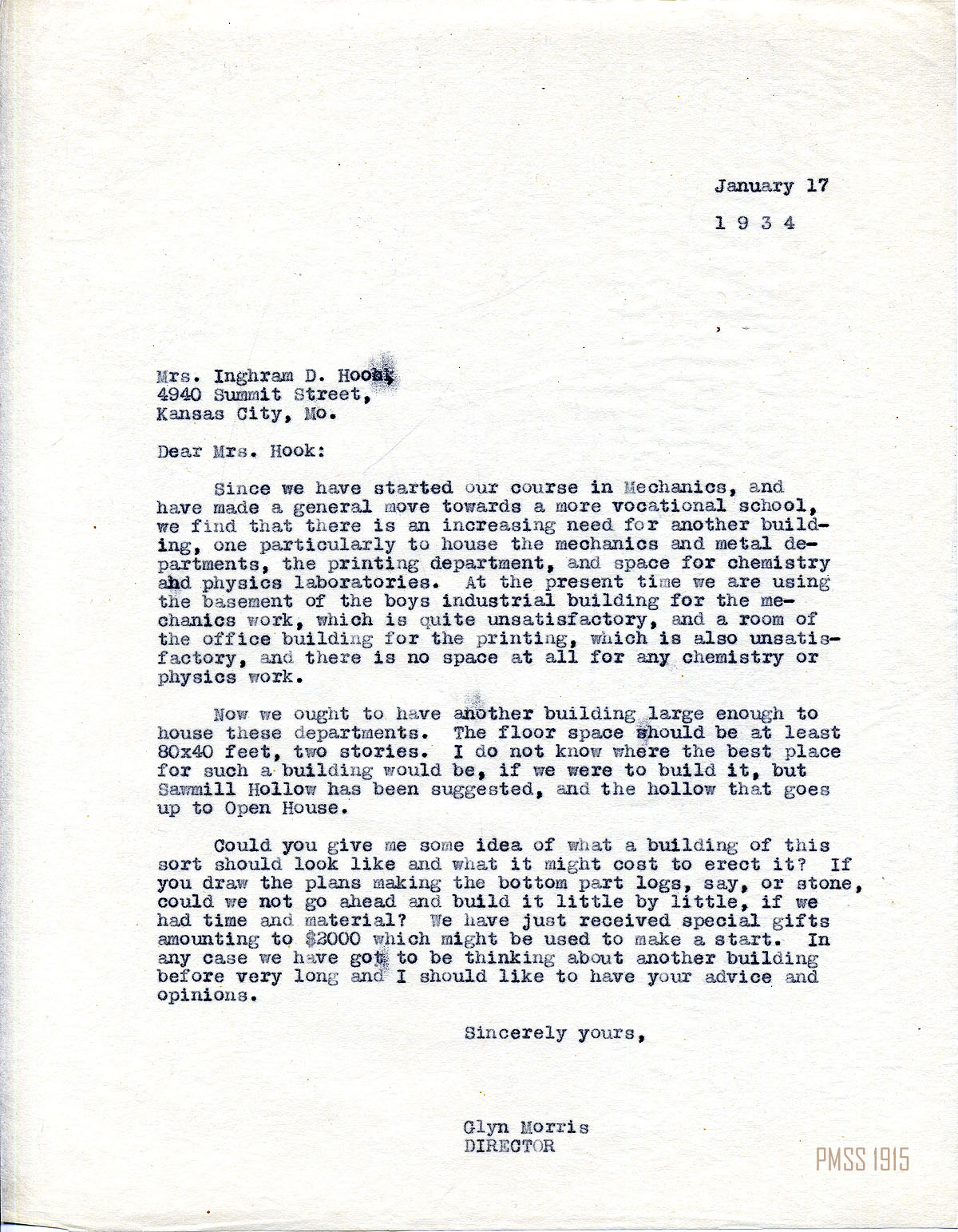 001 January 17, 1934. To “Mrs. Hook” (Mrs. Inghram D. Hook”), Kansas City, Mo., from Glyn Morris, Director, who describes the School’s need for a new building. “Since we have started our course in Mechanics, and have made a general move towards a more vocational school, we find that there is an increasing need for another building, one particularly to house the mechanics and metal departments, the printing department, and space for chemistry and physics laboratories.” He details the current situation, ideas for the location of the new building, its size, and possible building materials. He asks for Hook’s advice and cost estimate. “We have just received special gifts amounting to $2,000 which might be used to make a start.”