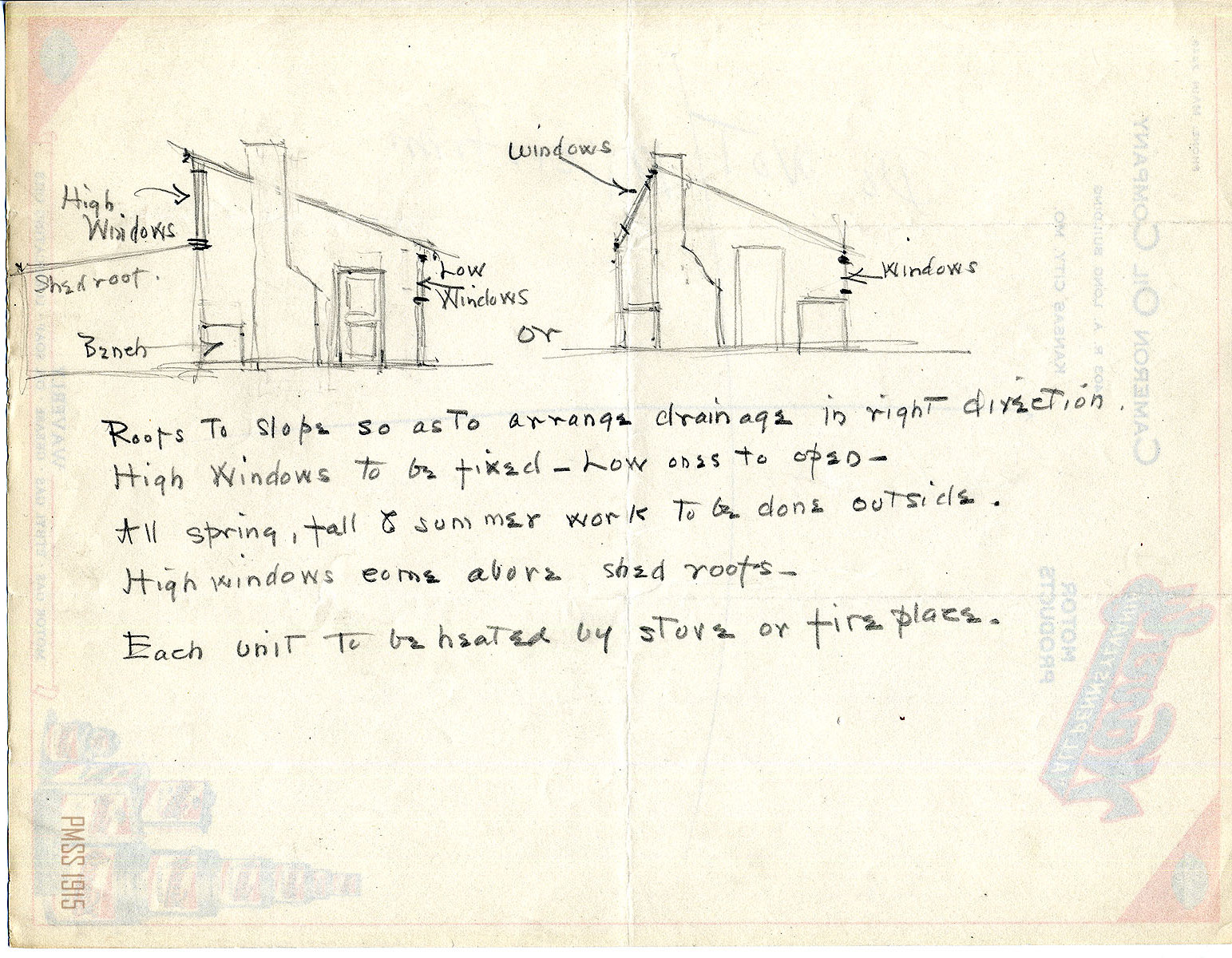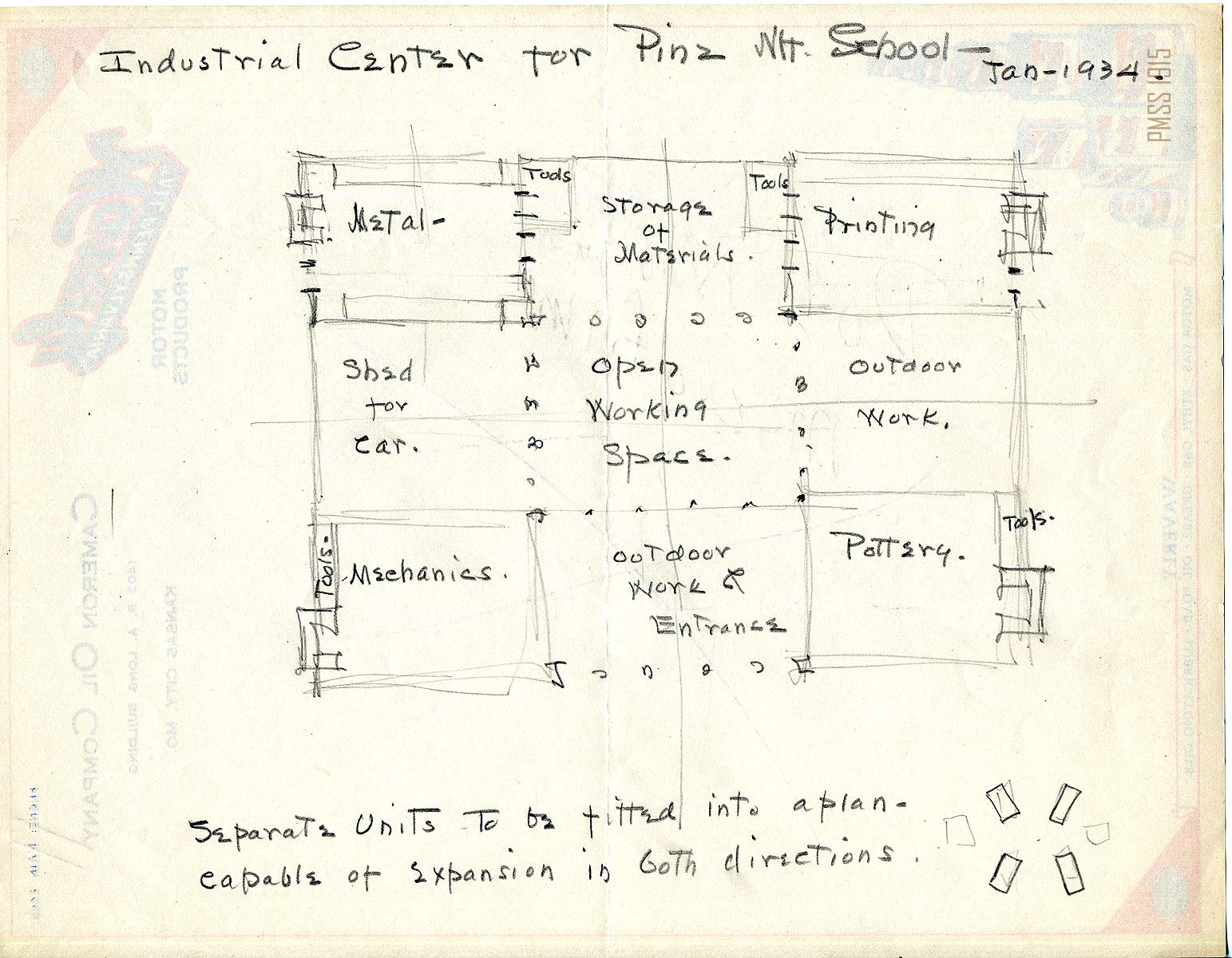 002a-002b January 1934. [002a] Hand-drawn floor plan for the “Industrial Center for Pine Mt. School” with areas for metal, printing mechanics, and pottery, storage, car shed, and open working spaces. “Separate units to be fitted into a plan capable of expansion in both directions.” [002b] Hand-drawn view of side of building, with descriptions.