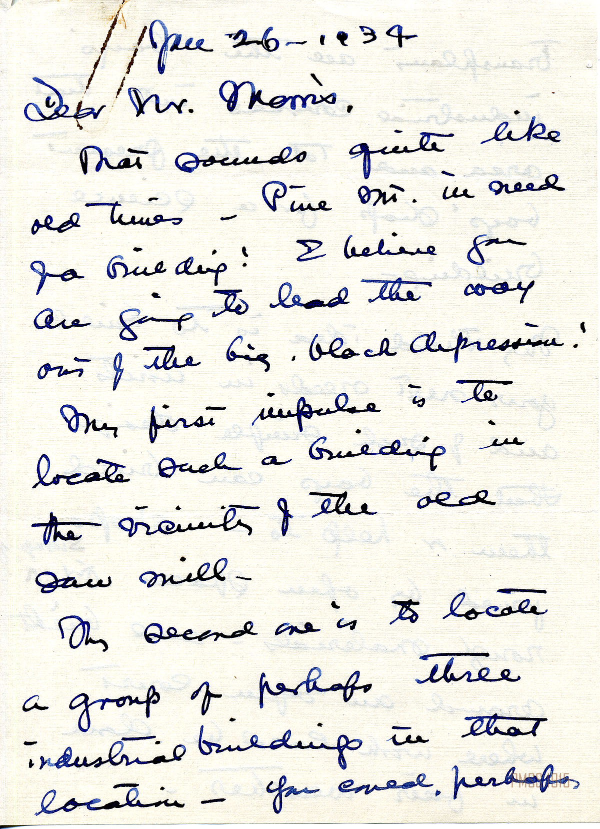005a-005b May 7, (no year, evidently 1934). Two-sided letter to “Mr. Morris” from “Mary R. Hook,” asking about progress on the proposed building. She hopes that Morris is “going to let the boys help build the shops in an informal location.”