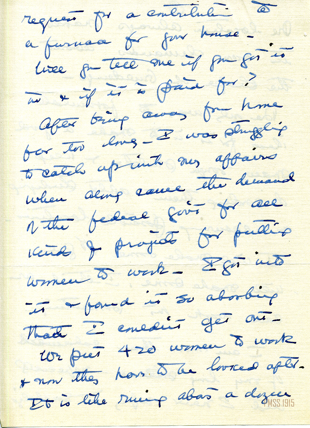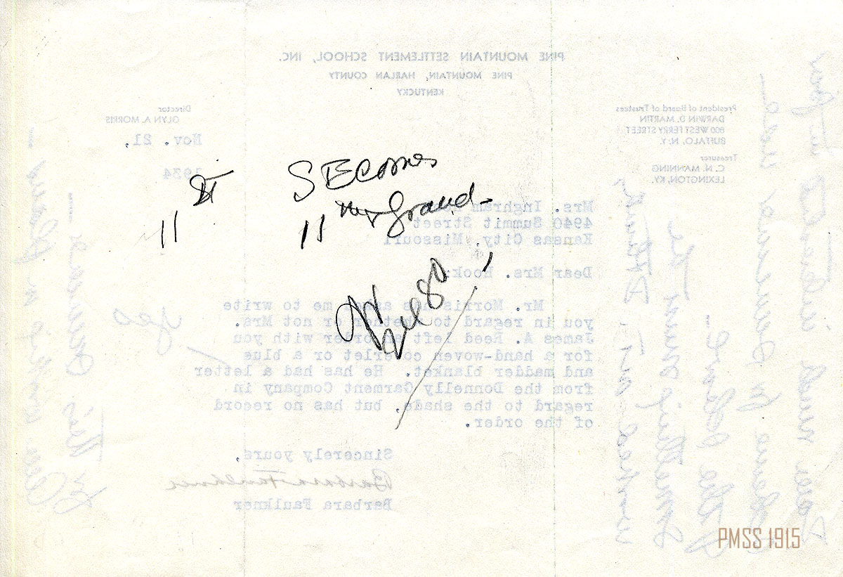 TAGS: Mary Rockwell Hook, correspondence 1934, Mrs. Inghram D. Hook, Glyn Morris, vocational education, building plans, Industrial Building, federal work projects, Mountain Life and Work, Sawmill Hollow, donations, Zande House Furnace Fund, Open House, Ruth Hook, Mr. and Mrs. Wilson O’Connell, summer camps, Morris talks in Kansas City, Mrs. Margaret Ostertag, model houses, Barbara Faulkner, Annie Longfellow Thorpe estate, moving pictures of PMSS, mailing lists, Mrs. Bertram Rockwell, architecture, architects