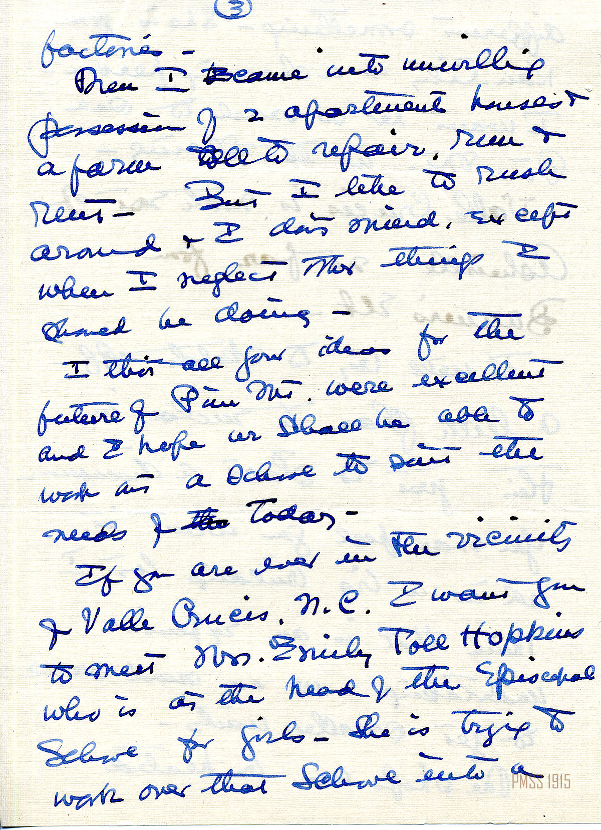 003a-003g January 26, 1934. Seven-page letter to “Mr. Morris” from “Mary Rockwell Hook.” [003a-c] Relates her ideas concerning location of the building. “The location always makes its own demands about the shape of buildings.” Suggests that she and Morris make several trial sketches. [003d] Hook tells about joining with the federal government’s “projects for putting women to work. I got into it & found it so absorbing that I couldn’t get out.” [003e] Hook also has become the owner of two apartment houses and a farm to repair and rent. She suggests that Morris meet with Mrs. Emily Toll Hopkins, head of the Episcopal School for Girls in Valle Crucis, NC. [003f-g] Hook will send Morris a sketch “just to start a discussion. You may feel you want it all in a big building but I think that is an expensive undertaking & we are much surer to get smaller units.”