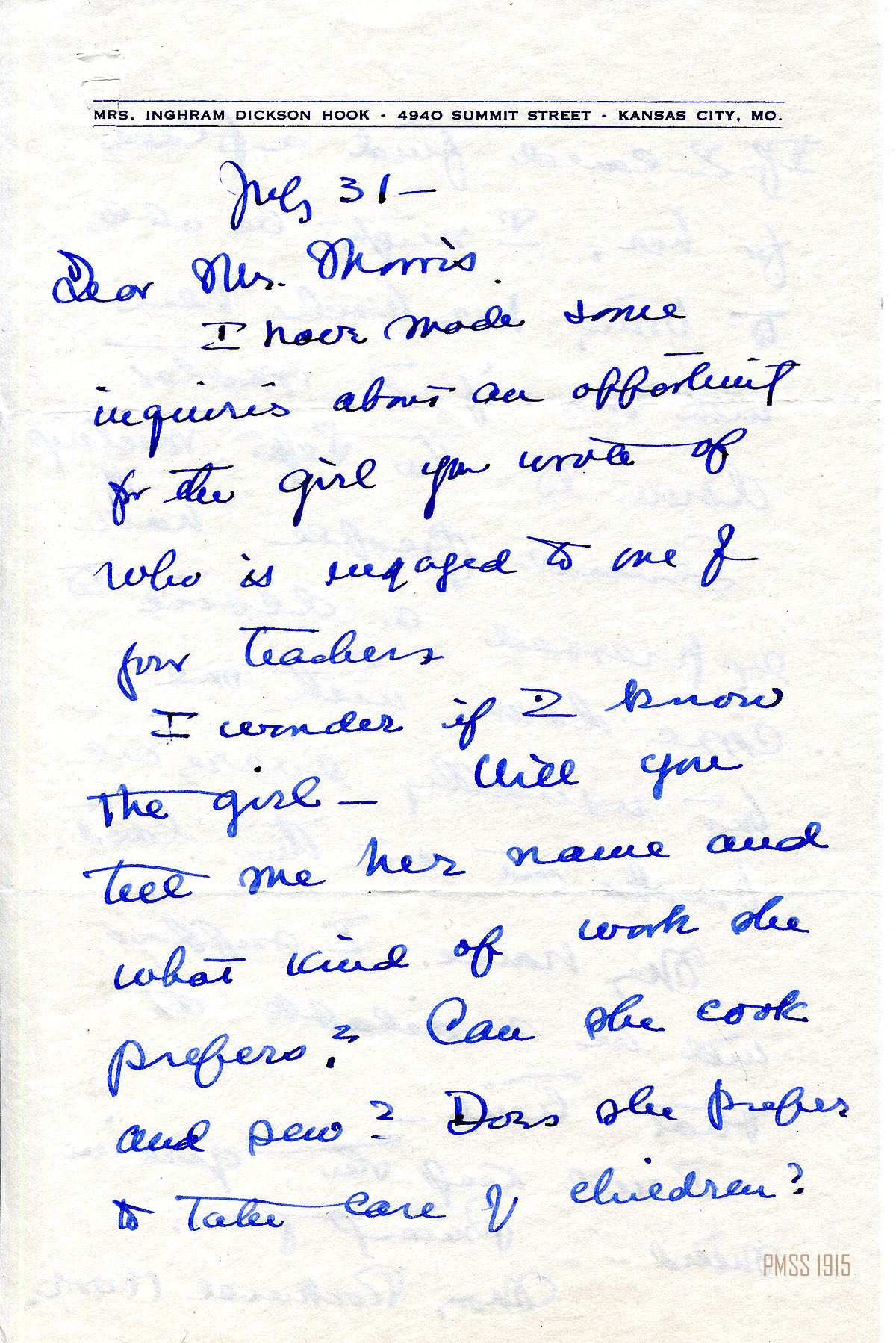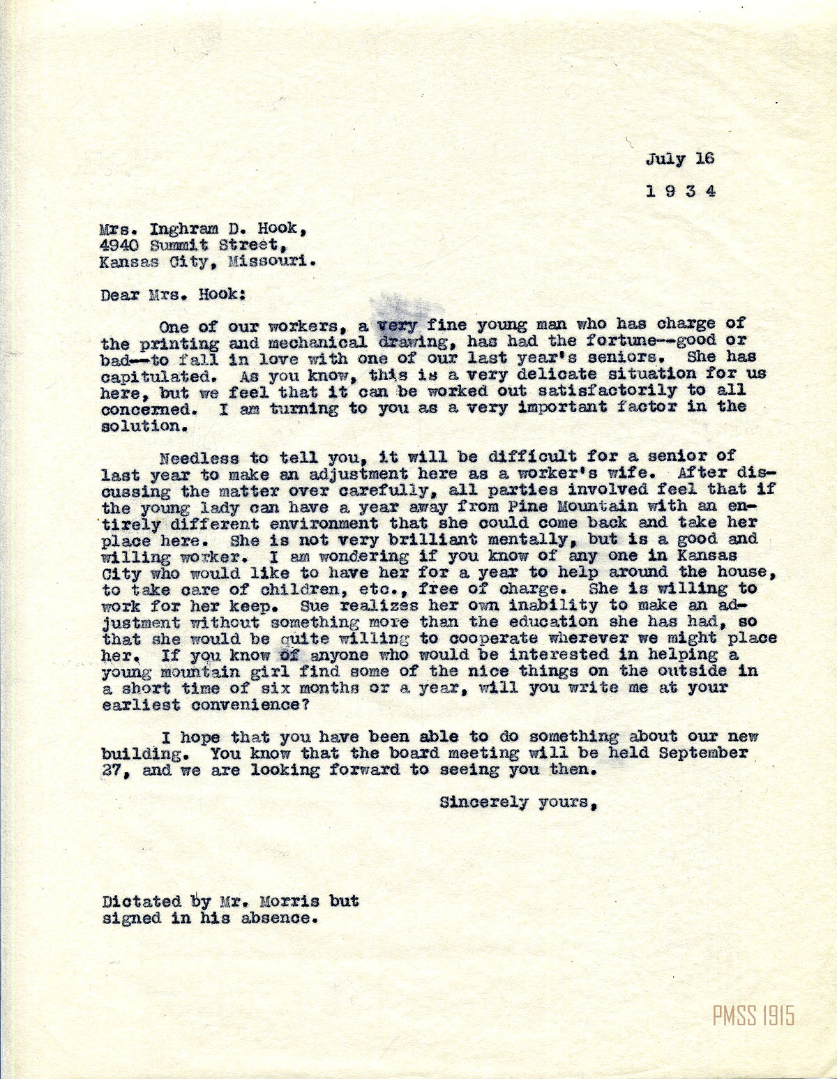 009 July 16, 1934. To Hook from Morris, who asks Hook if she can recommend someone in the Kansas City area who may take in a “young mountain girl” for six months of a year. He explains the “delicate” situation and why this move is necessary.