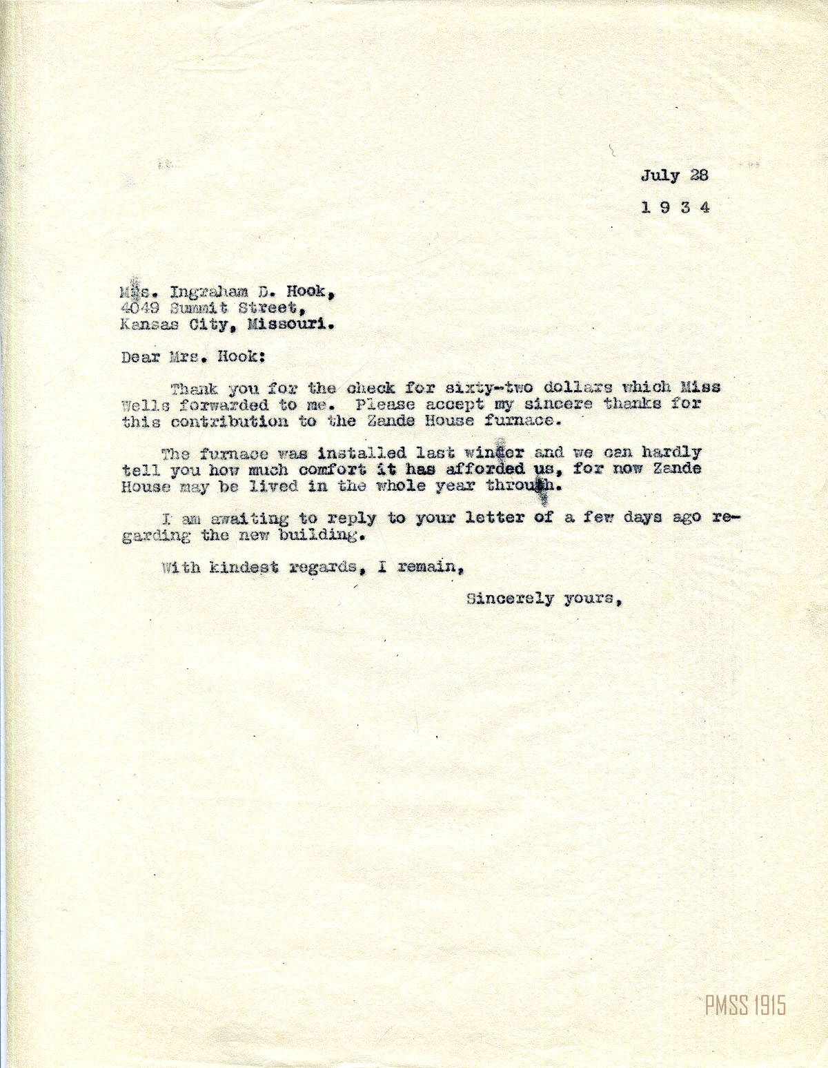 010 July 28, 1934. To Hook from (unsigned), thanking her for her $62 contribution to the Zande House furnace. It was installed last winter and “now Zande House may be lived in the whole year through.”