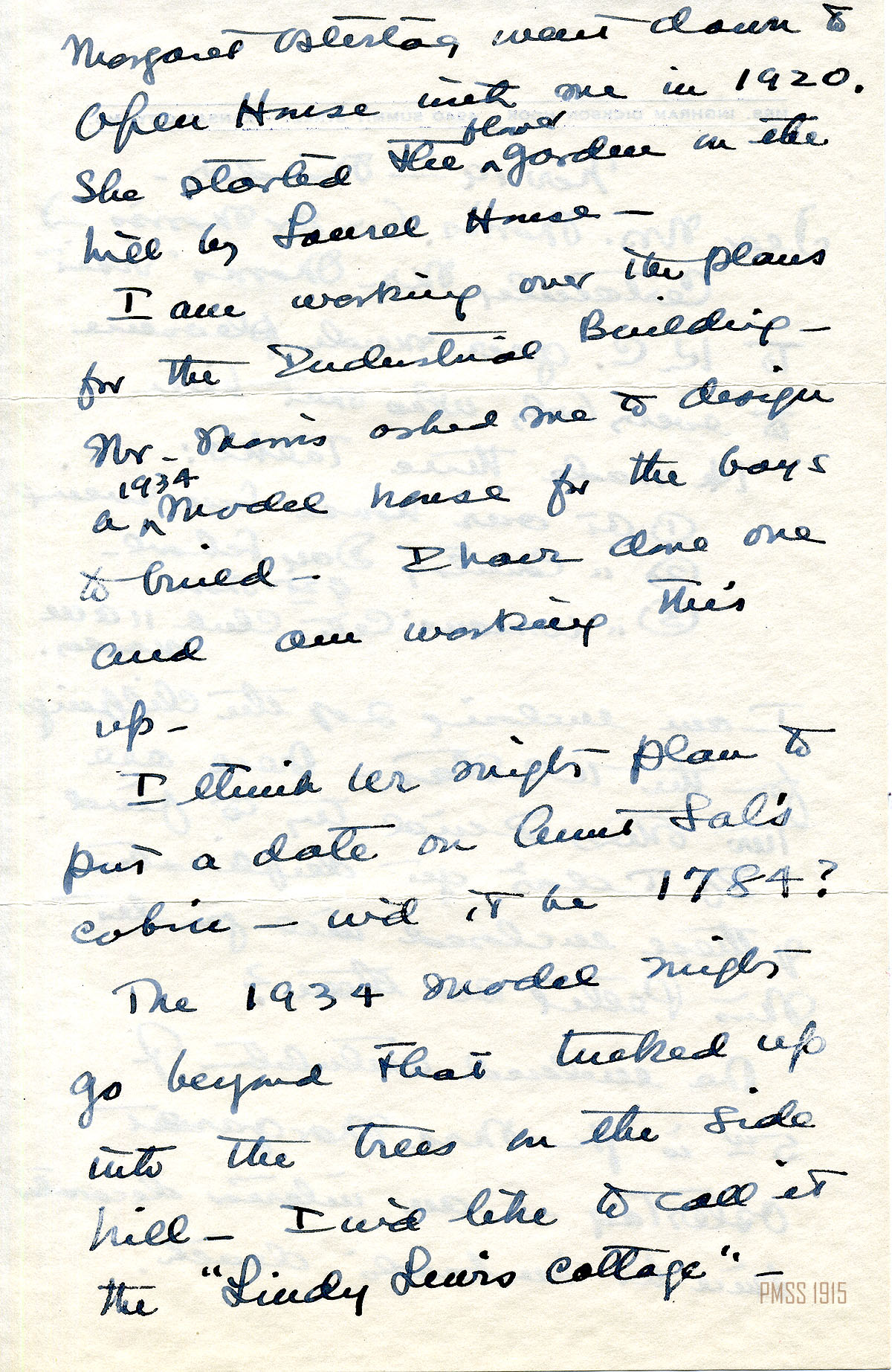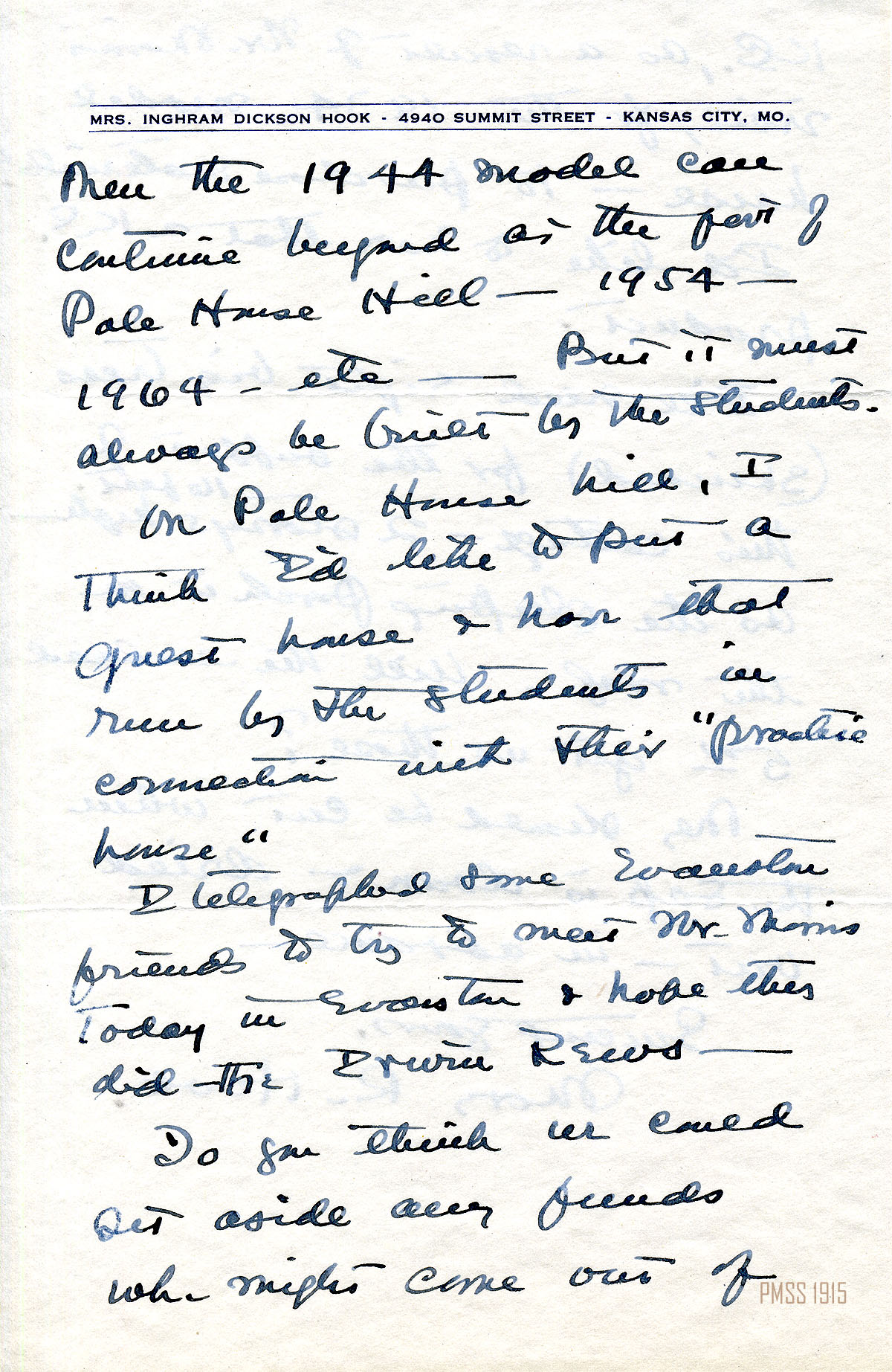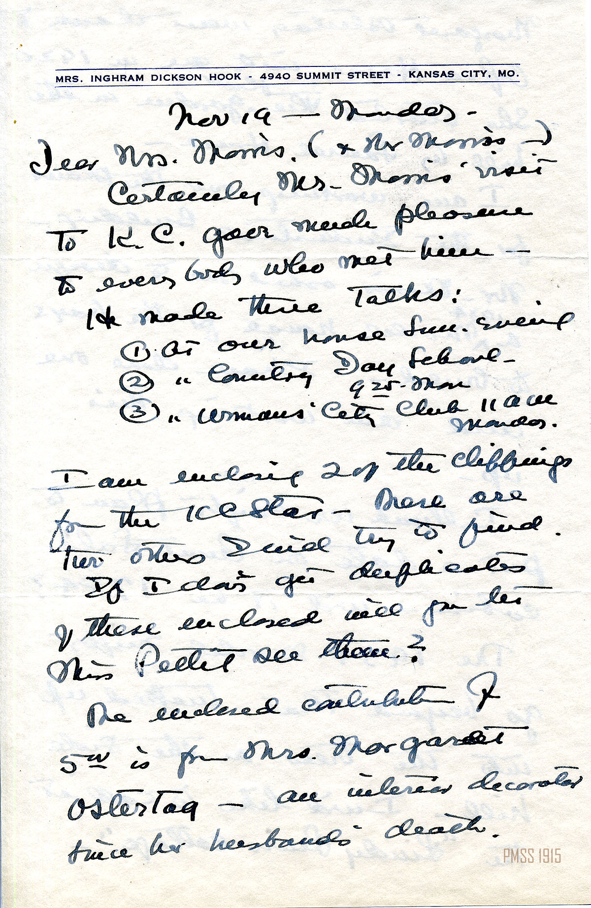 018a-18d November 19 (no year). Four-page letter to “Mrs. Morris (& Mr. Morris)” from Mary R. Hook, who [018a] lists the three talks Morris gave during his Kansas City visit; encloses clippings from the K.C. Star. She also encloses a $5.00 contribution from Mrs. Margaret Ostertag, interior decorator. [018b] Ostertag had visited PMSS with Hook in 1920; “She started the flower garden on the hill by Laurel House.” Hook suggests putting a date on Aunt Sal’s cabin – possibly 1784. “The 1934 model might go beyond that, tucked up into the trees on the side hill. I w’d like to call it the ‘Lindy Lewis Cottage.’” [018c] “Then the 1944 model (house) can continue beyond as the part of Pole House Hill — 1943 — 1964 — etc. But it must always be built by the students. On Pole House Hill, I think I’d like to put a guest house & have that run by the students in connection with their ‘practice house.’” [018d] Asks whether K.C. friends could be donors for the 1934 model house as a result of Mr. Morris’s visit. “I’d like to have that a K.C. product.” Request eight big trees (skinned) for the cottage, which she then describes.