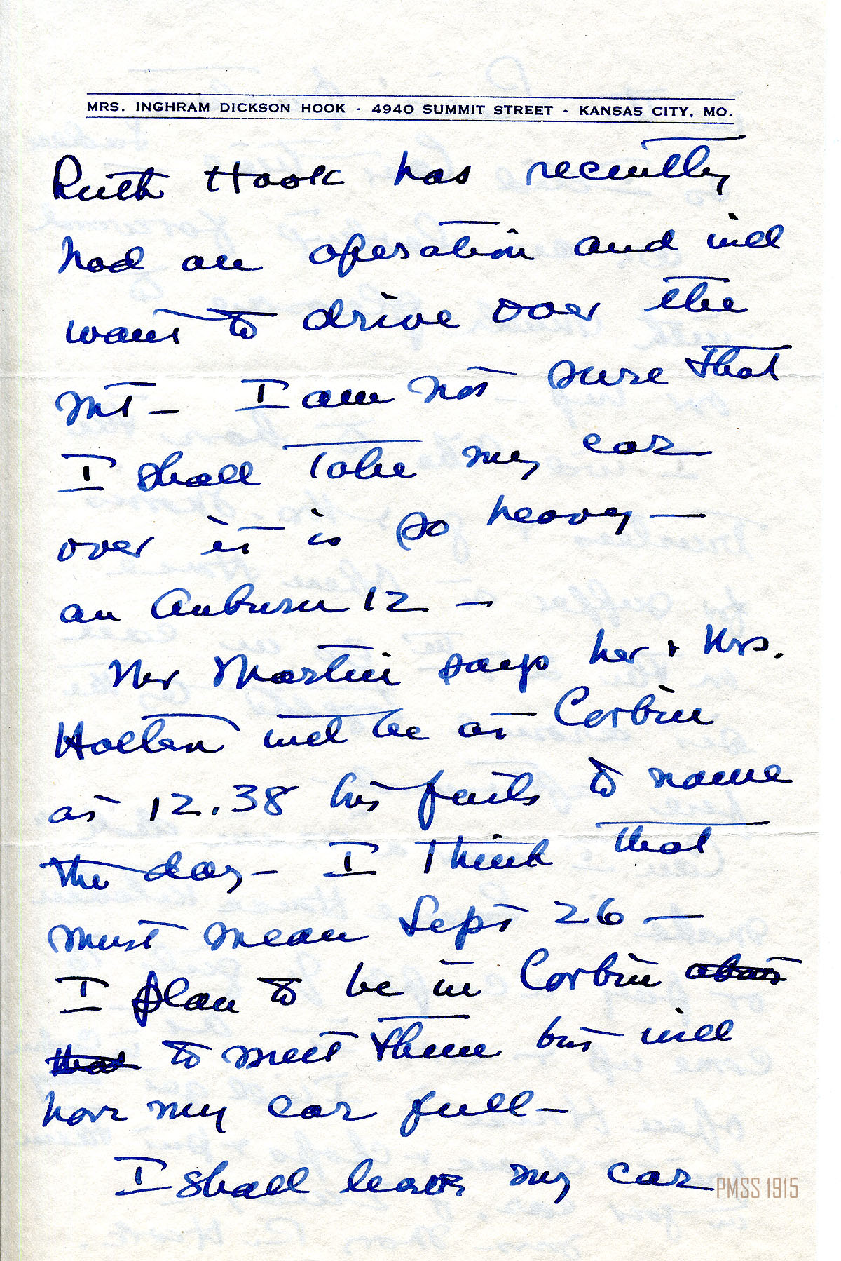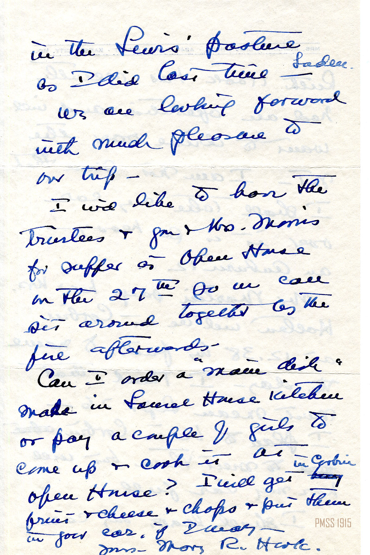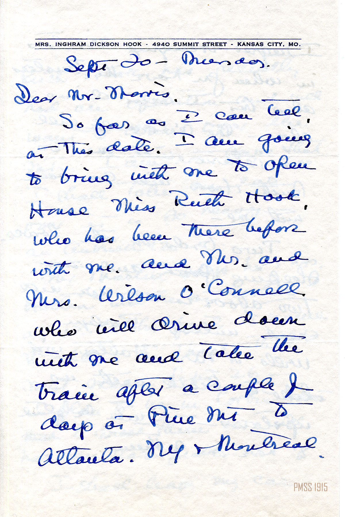 018a-18d November 19 (no year). Four-page letter to “Mrs. Morris (& Mr. Morris)” from Mary R. Hook, who [018a] lists the three talks Morris gave during his Kansas City visit; encloses clippings from the K.C. Star. She also encloses a $5.00 contribution from Mrs. Margaret Ostertag, interior decorator. [018b] Ostertag had visited PMSS with Hook in 1920; “She started the flower garden on the hill by Laurel House.” Hook suggests putting a date on Aunt Sal’s cabin – possibly 1784. “The 1934 model might go beyond that, tucked up into the trees on the side hill. I w’d like to call it the ‘Lindy Lewis Cottage.’” [018c] “Then the 1944 model (house) can continue beyond as the part of Pole House Hill — 1943 — 1964 — etc. But it must always be built by the students. On Pole House Hill, I think I’d like to put a guest house & have that run by the students in connection with their ‘practice house.’” [018d] Asks whether K.C. friends could be donors for the 1934 model house as a result of Mr. Morris’s visit. “I’d like to have that a K.C. product.” Request eight big trees (skinned) for the cottage, which she then describes.