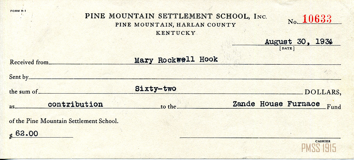 013 August 30, 1934. PMSS receipt of a $62 check from Mary Rockwell Hook as contribution to the Zande House Furnace Fund.