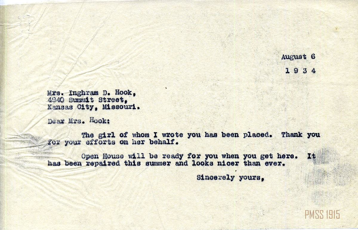 014 August 6, 1934. To Hook from (unsigned, likely Morris). “The girl of whom I wrote you has been placed. Thank you for your efforts on her behalf.”