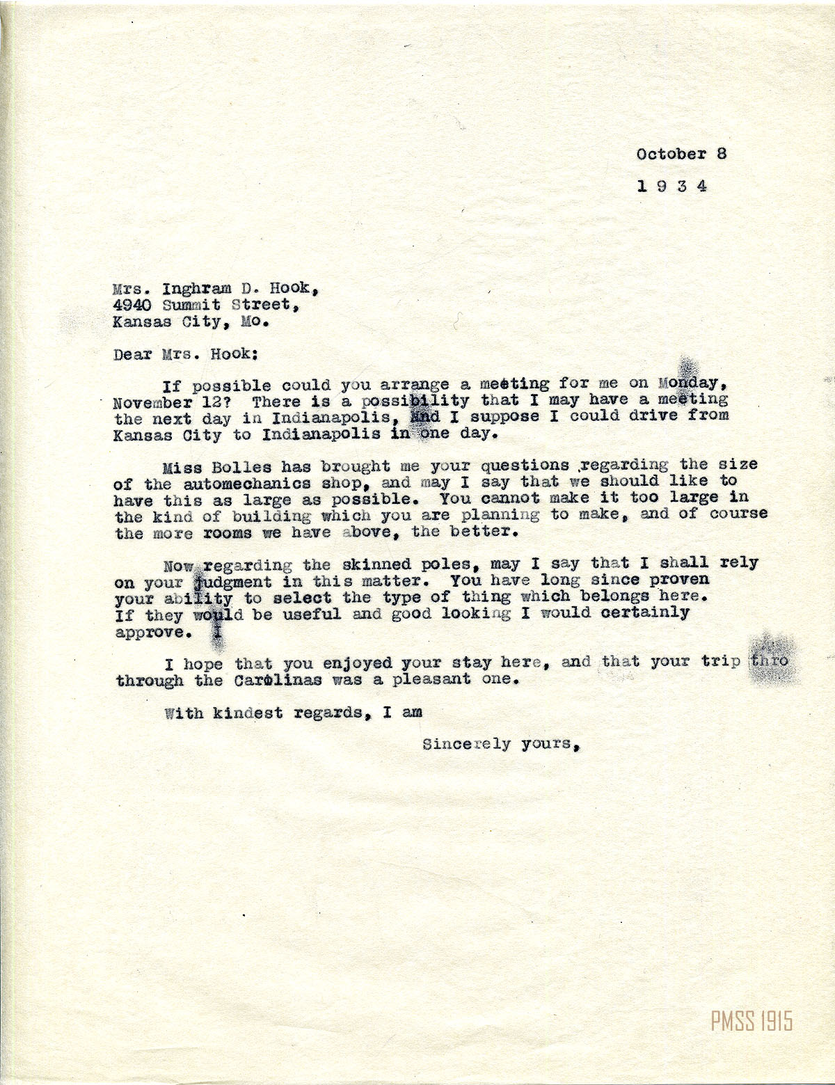 015 October 8, 1934. To Hook from (unsigned, likely Morris), who asks to meet with her on November 12 in Kansas City. Answers Hook’s questions (via Miss (Dorothy) Bolles) about the size of the auto mechanics shop and the “skinned poles.”