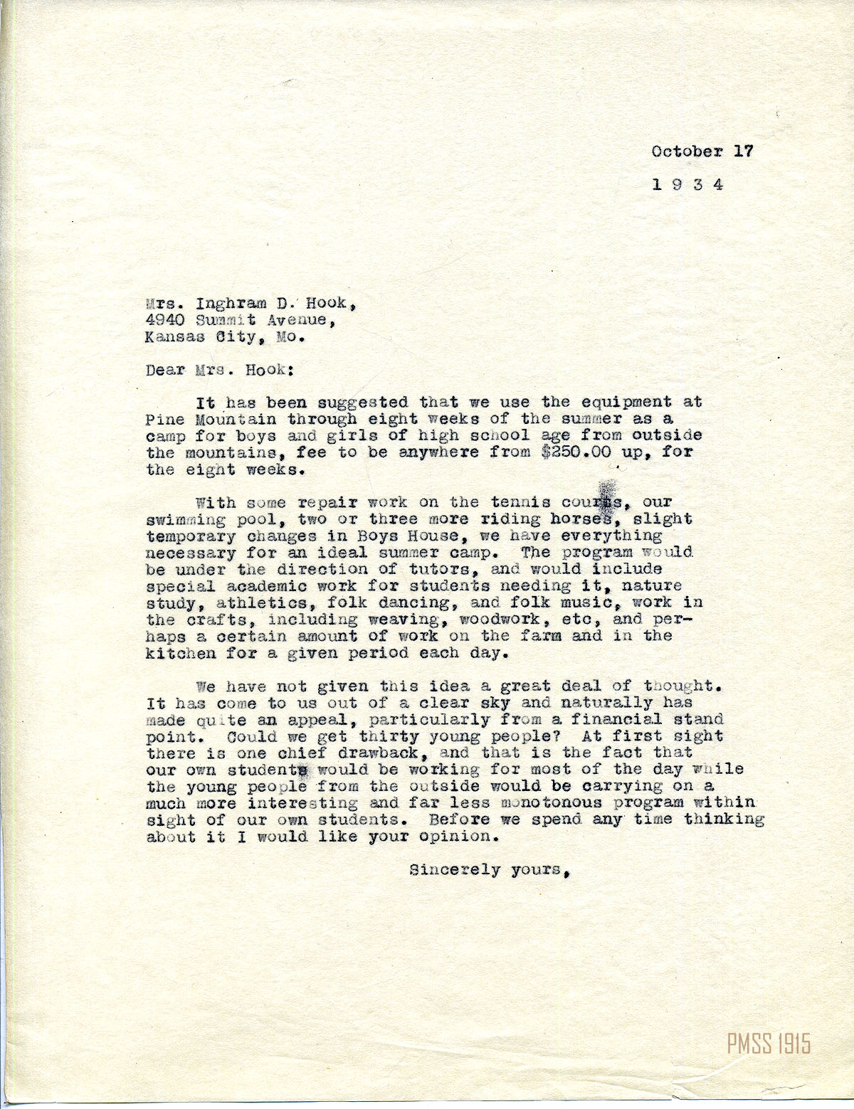 016 October 17, 1934. To Hook from (unsigned, likely Morris), who asks for her opinion about having an eight-week summer camp at PMSS for high school age boys and girls from outside the mountains. He describes how it would be run. The income would be appealing but the drawback is that “our own students would be working for most of the day while the young people from the outside would be carrying on a much more interesting and far less monotonous program….”