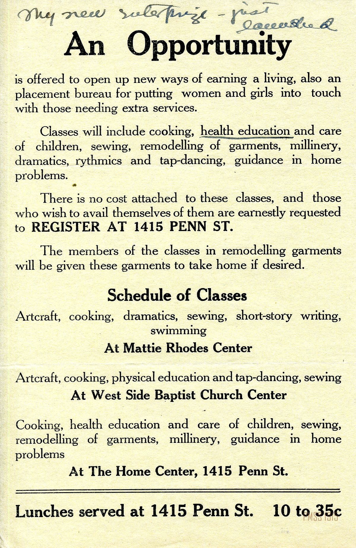 017 N.D. A flyer about classes for women and girls “to open up new ways of earning a living…” and to act as a placement bureau. Lists the classes offered. Notation in Hook’s handwriting in top margin: “My new (?) – just (?).”