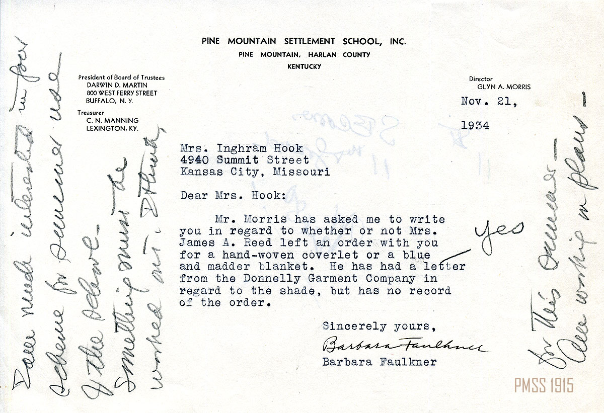 019a-019b November 21, 1934. To Hook from Barbara Faulkner on PMSS stationery, asking Mr. Morris whether or not Mrs. James A. Read ordered a handwoven coverlet or a blanket. (Hook responds by writing in the margins of the same page.) [019b] Reverse side of letter with brief notation in Hook’s handwriting.