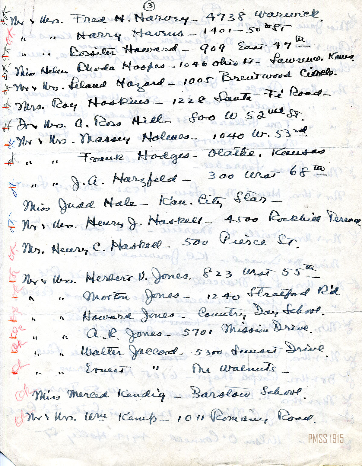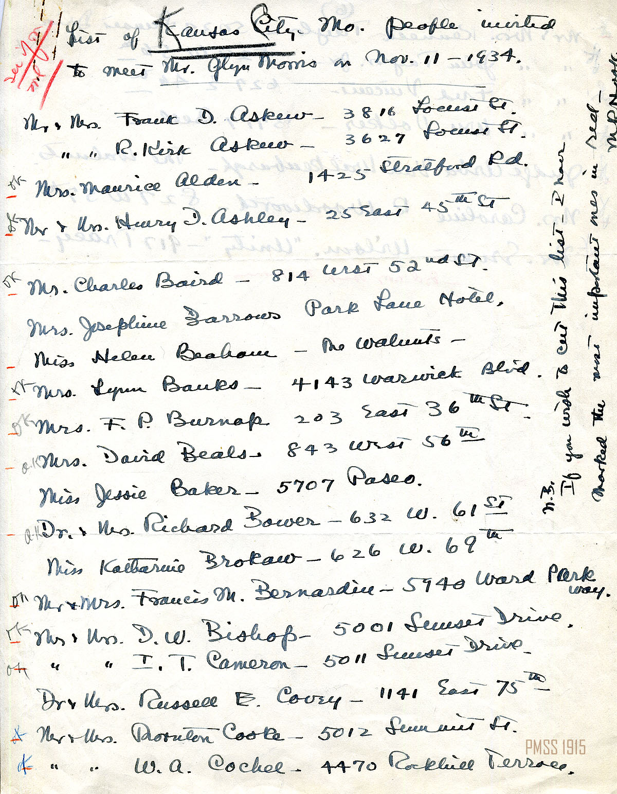 020a-020f N.D. Six pages of a “List of Kansas City, Mo., people invited to meet Mr. Glyn Morris on November 11, 1934.” in Hook’s handwriting.