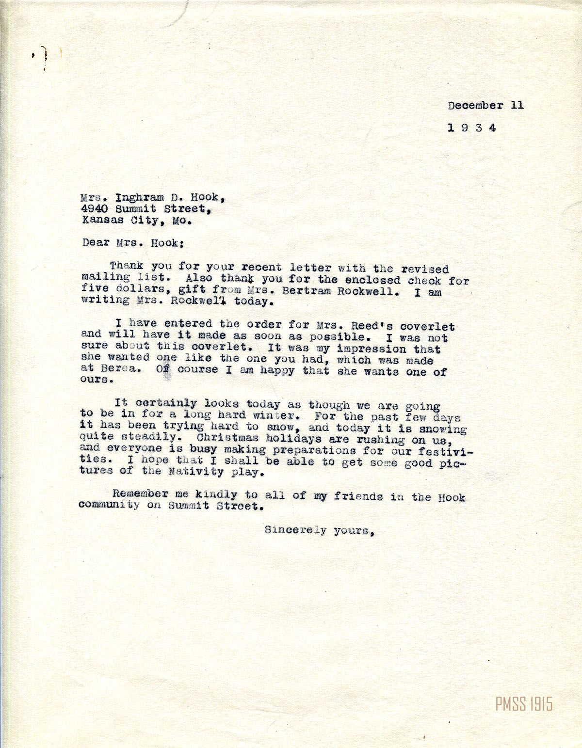 024 December 11, 1934. To Hook from (unsigned, likely Morris), thanking her for the revised mailing list and $5.00 donation from Mrs. Bertram Rockwell. He has ordered the coverlet from Mrs. Reed.
