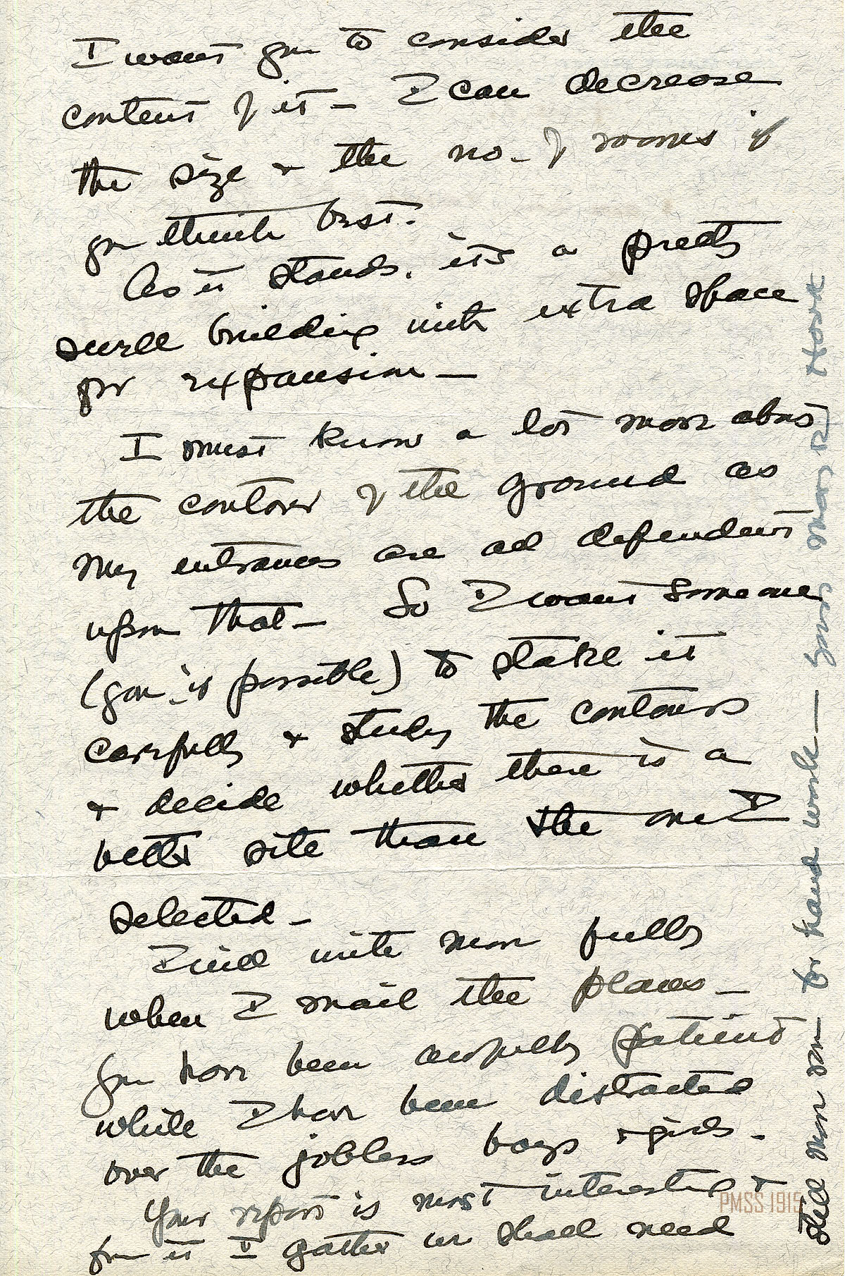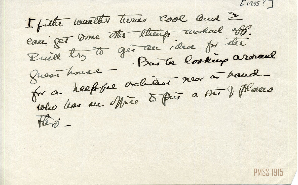 002 N.D. (Later notation: “[1935?]”) If she can, Hook will work on plans for the guest house. “But be looking around for a helpful architect near at hand who has an office to put a set of plans (?)”