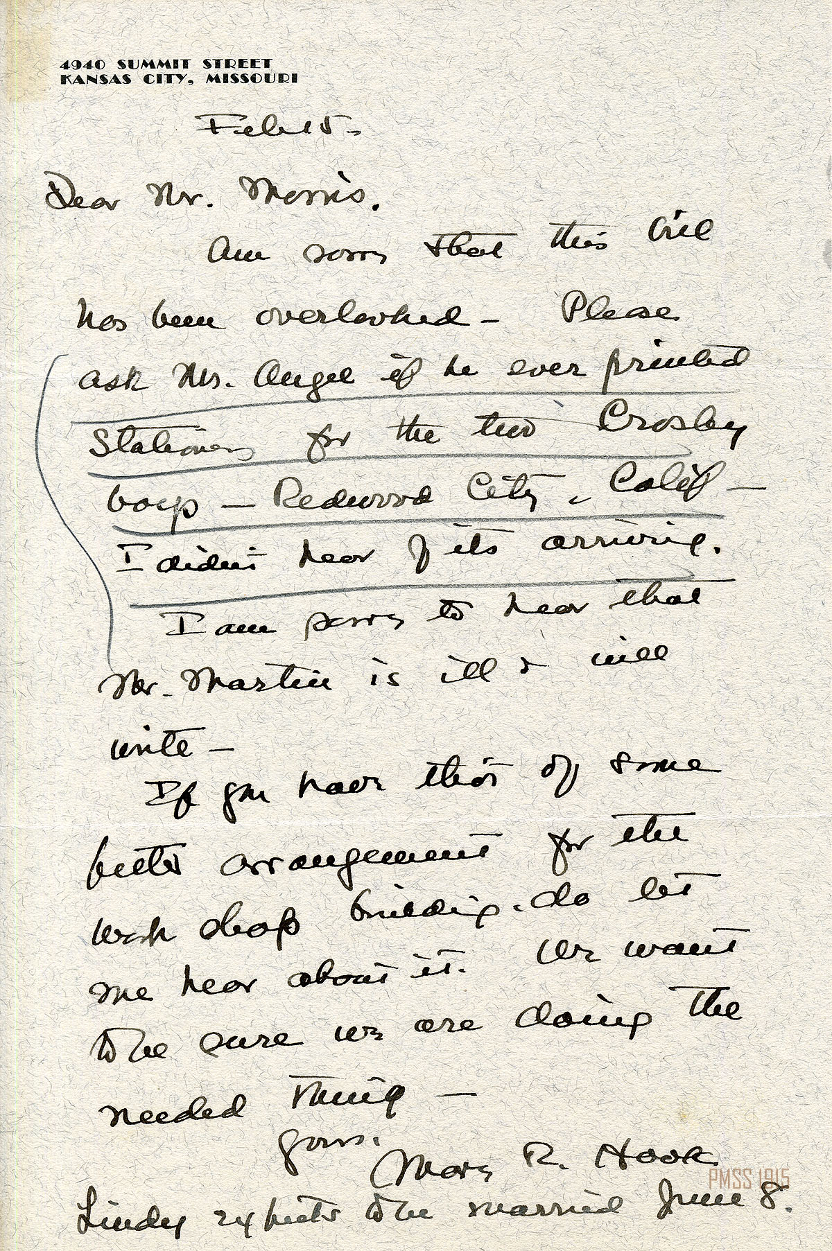 003 February 15, (no year). To Morris from Hook, asking Morris if he would ask Mr. (August) Angel if he has printed stationery for the two Crosby boys, Redwood City, Calif. Mentions that Lindy will marry in June.