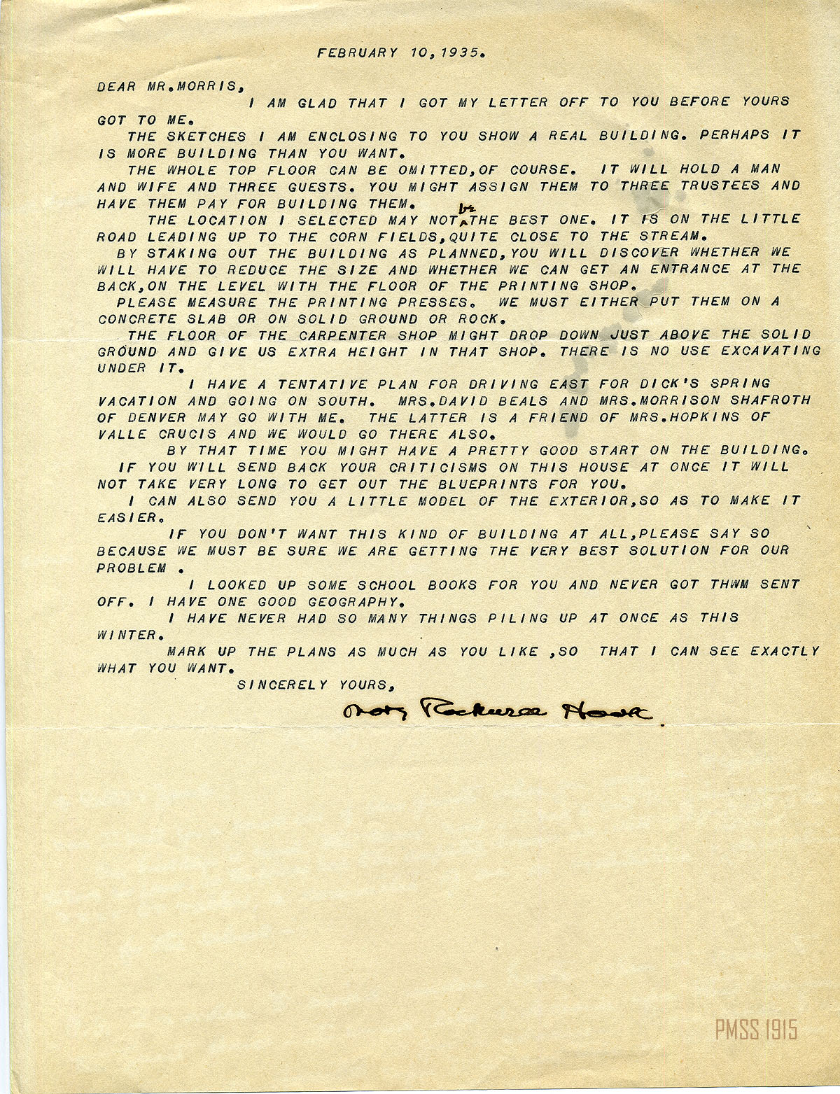 004 February 10, 1935. Typewritten letter to Morris from Hook, who encloses sketches for the (Industrial) building, mentioning plans for the top floor, the building’s location, accommodating the printing presses, and the floor for the carpenter shop. Asks for Morris’s comments before sending the blueprints and possibly a model. Tells of her plans to drive east with friends.