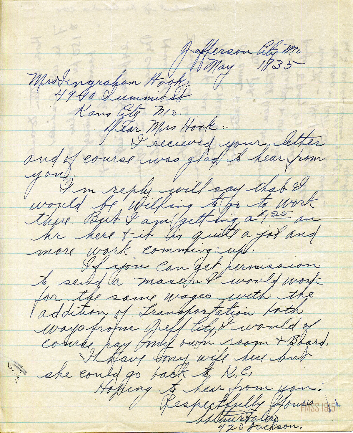008a May (no day), 1935. To Hook from Arthur Halcro, Jefferson City, Mo., who agrees to work (as a stonemason) and states the terms and wages.