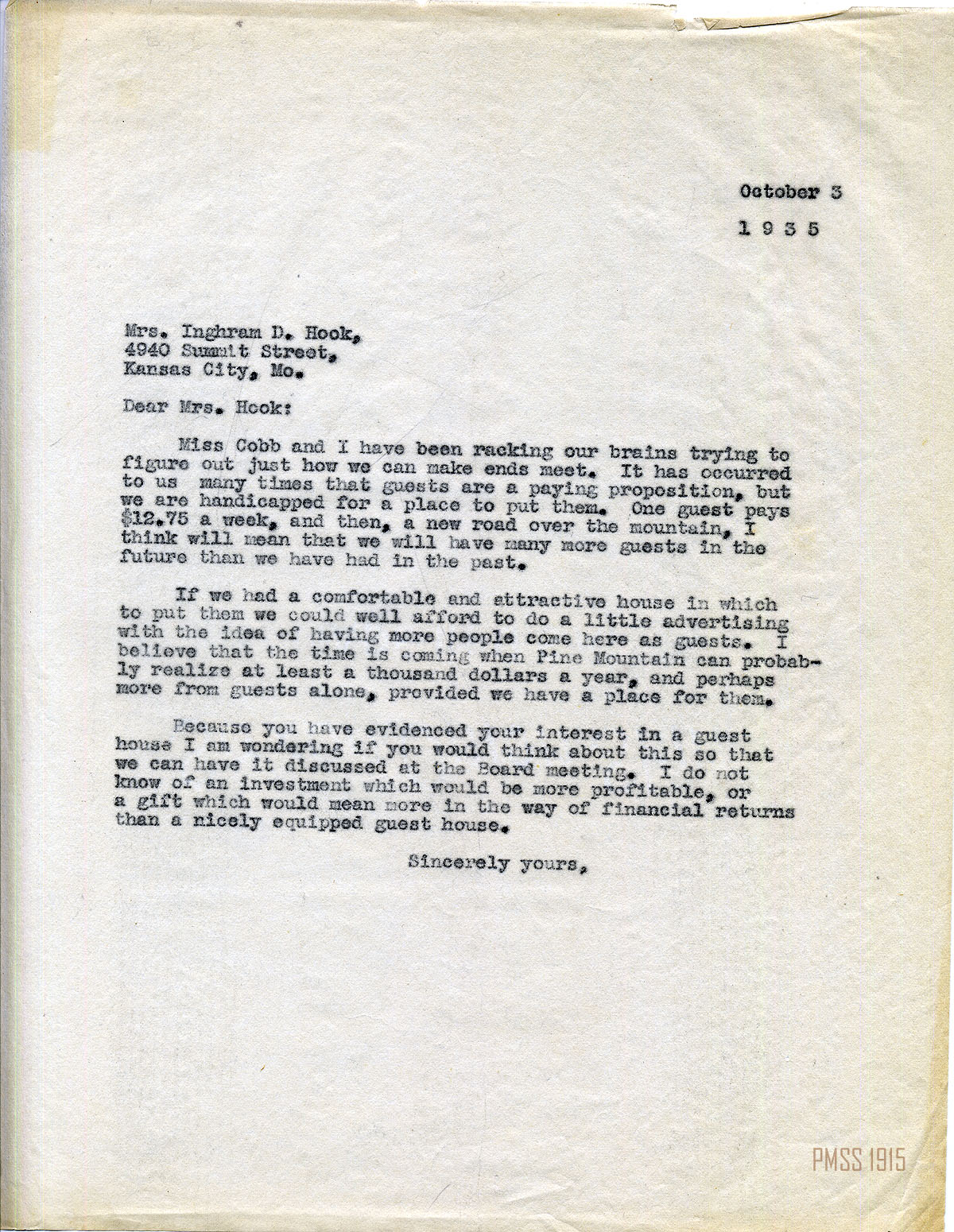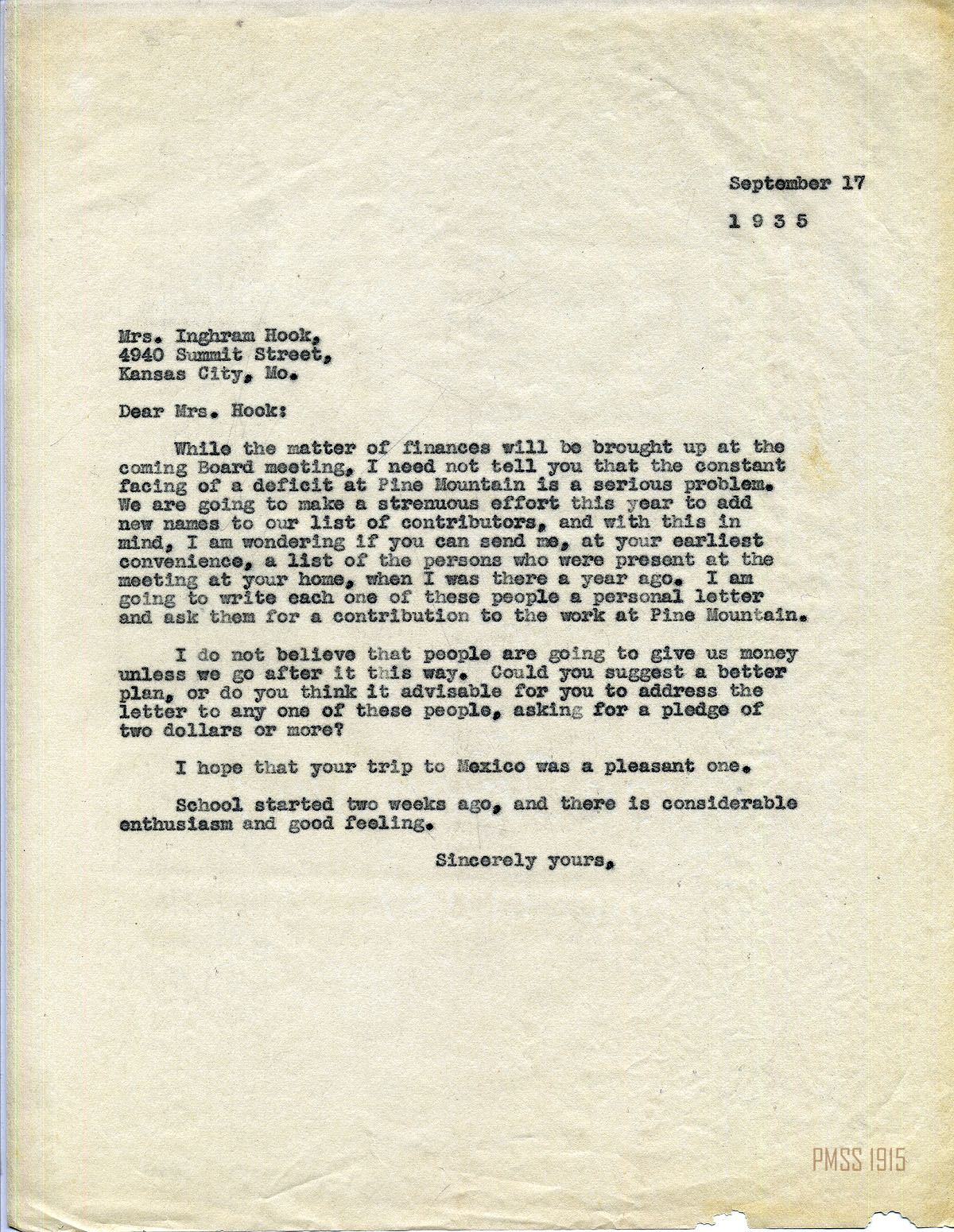 019 September 17, 1935. To Hook from (unsigned, likely Morris) who is concerned about “the constant facing of a deficit at Pine Mountain” and plans to increase the School’s list of contributors. He asks Hook if she will send a list of the persons that were at her meeting that he attended at her home a year ago. He plans to write to each person for a contribution. He asks for her opinion.