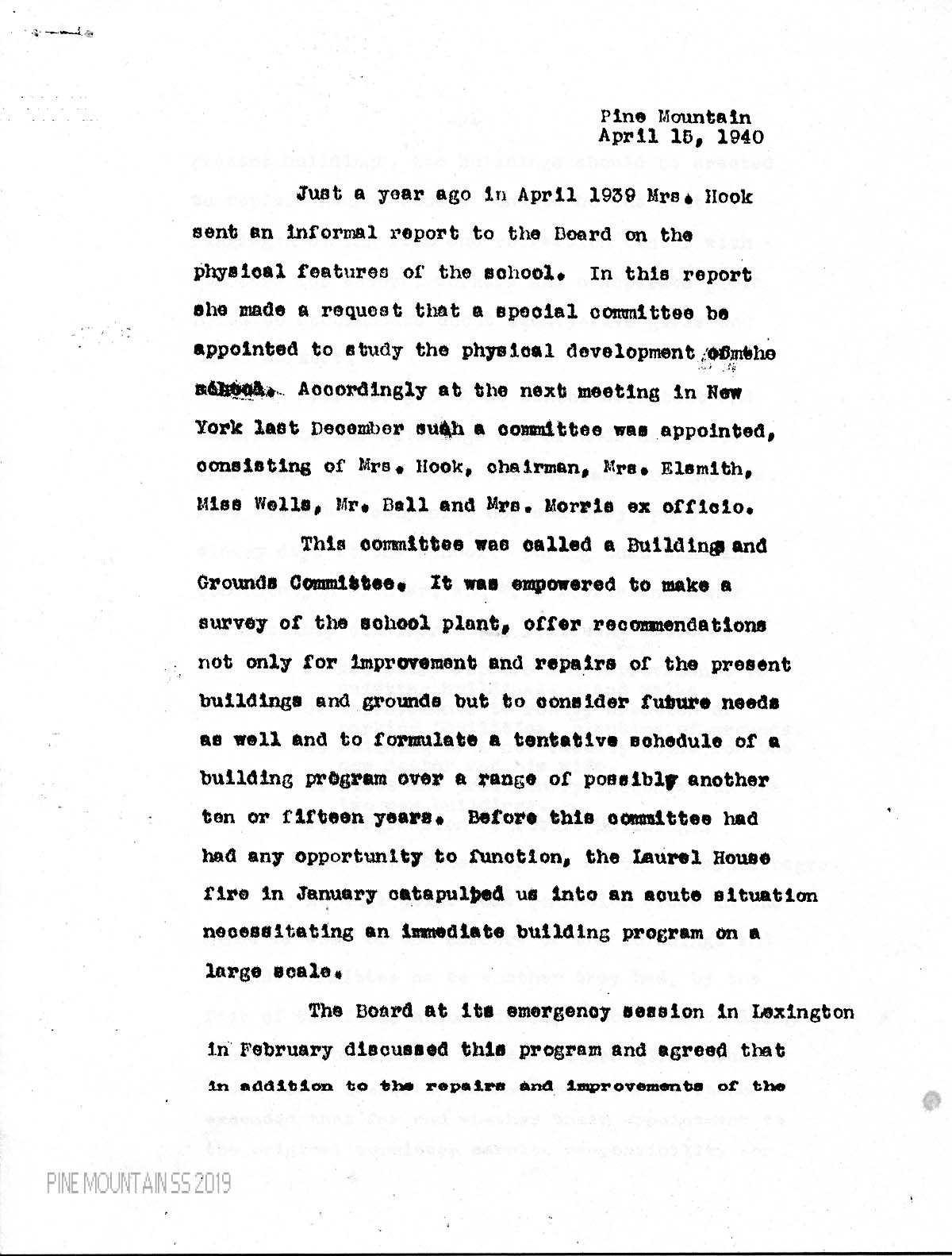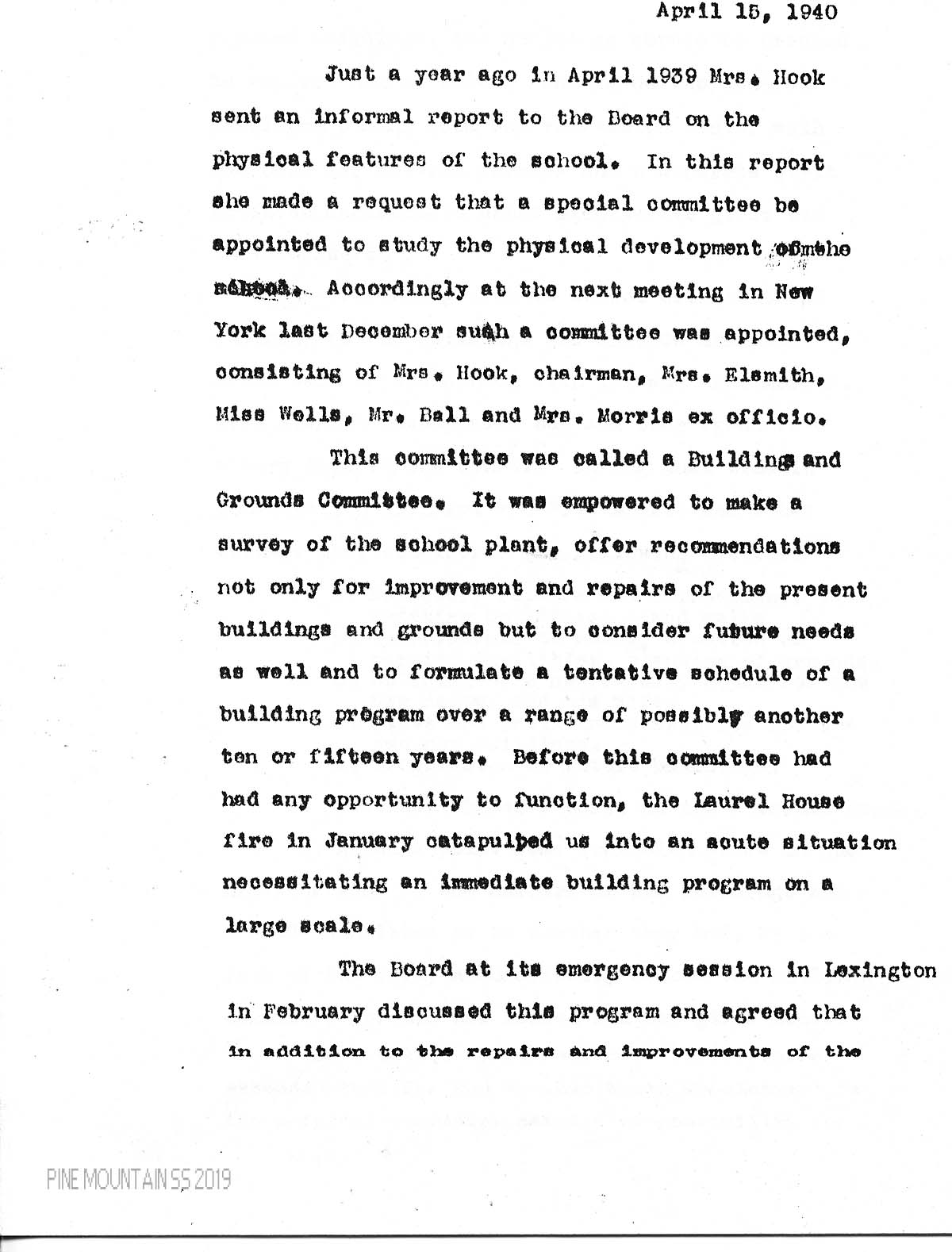 Just a year ago in April 1939 Mrs. Hook sent an informal report to the Board on the physical features of the school. In this report she made a request that a special committee be appointed to study the physical development of the school. Accordingly at the next meeting in New York last December such a committee was appointed, consisting of Mrs. Hook, chairman, Mrs. Elsmith, Miss Wells, Mr. Ball, and Mrs. Morris, ex officio.