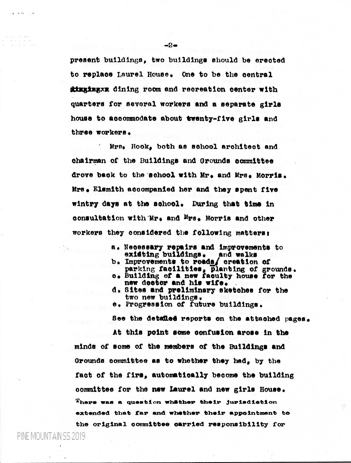 Mrs. Hook, both as school architect and chairman of the Buildings and Grounds Committee, drove back to the school with Mr. and Mrs. Morris, Mrs. Elsmith accompanied her and they spent five wintry days at the school. During that time in consultation with Mr. and Mrs. Morris and other workers, they considered the following matters: