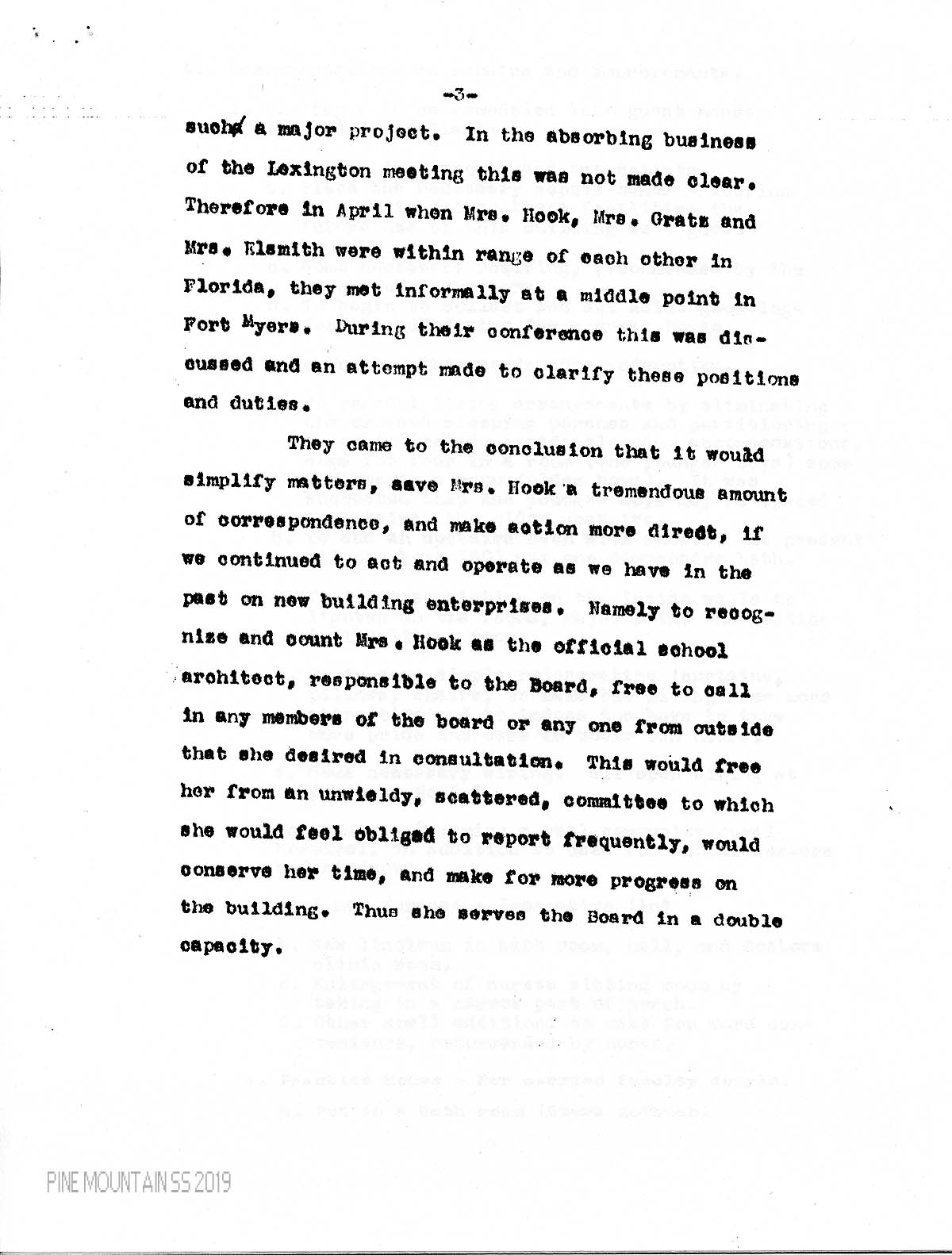 They came to the conclusion that it would simplify matters, save Mrs. Hook a tremendous amount of correspondence, and make action more direct if we continued to act and operate as we have in the past on new building enterprises. Namely, to recognize and count Mrs. Hook as the official school architect, responsible to the Board, free to call in any members of the Board or anyone from outside that she desired in consultation. This would free her from an unwieldy, scattered committee to which she would feel obliged to report frequently, would conserve her time, and make for more progress on the building. Thus, she serves the Board in a double capacity.