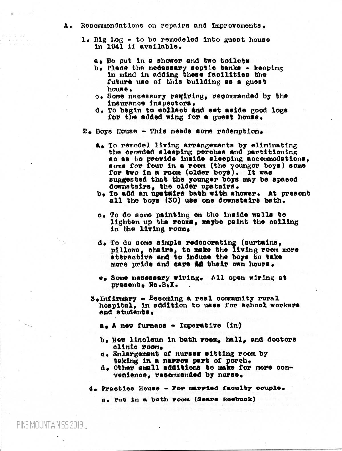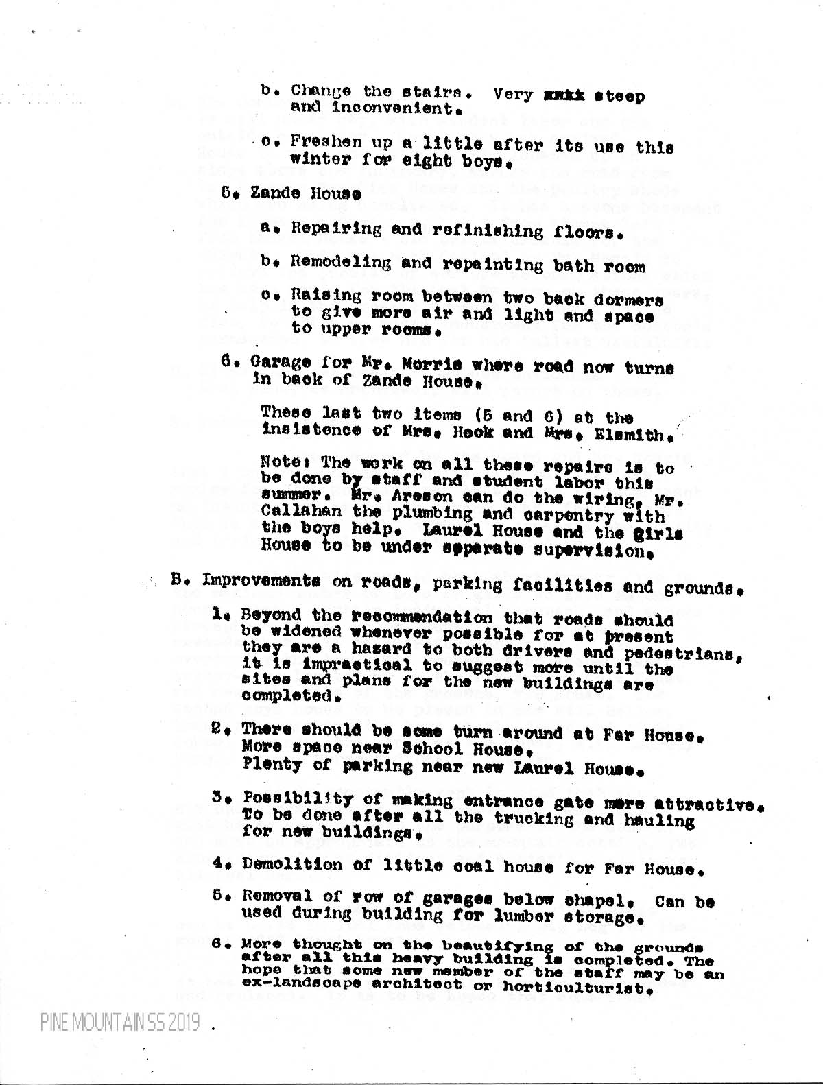 Note: The work on all these repairs is to be done by staff and student labor this summer. Mr. Areson can do the wiring; Mr. Callahan, the plumbing and carpentry with the boys’ help. Laurel House and the Girls’ House [West Wind] are to be under separate supervision.