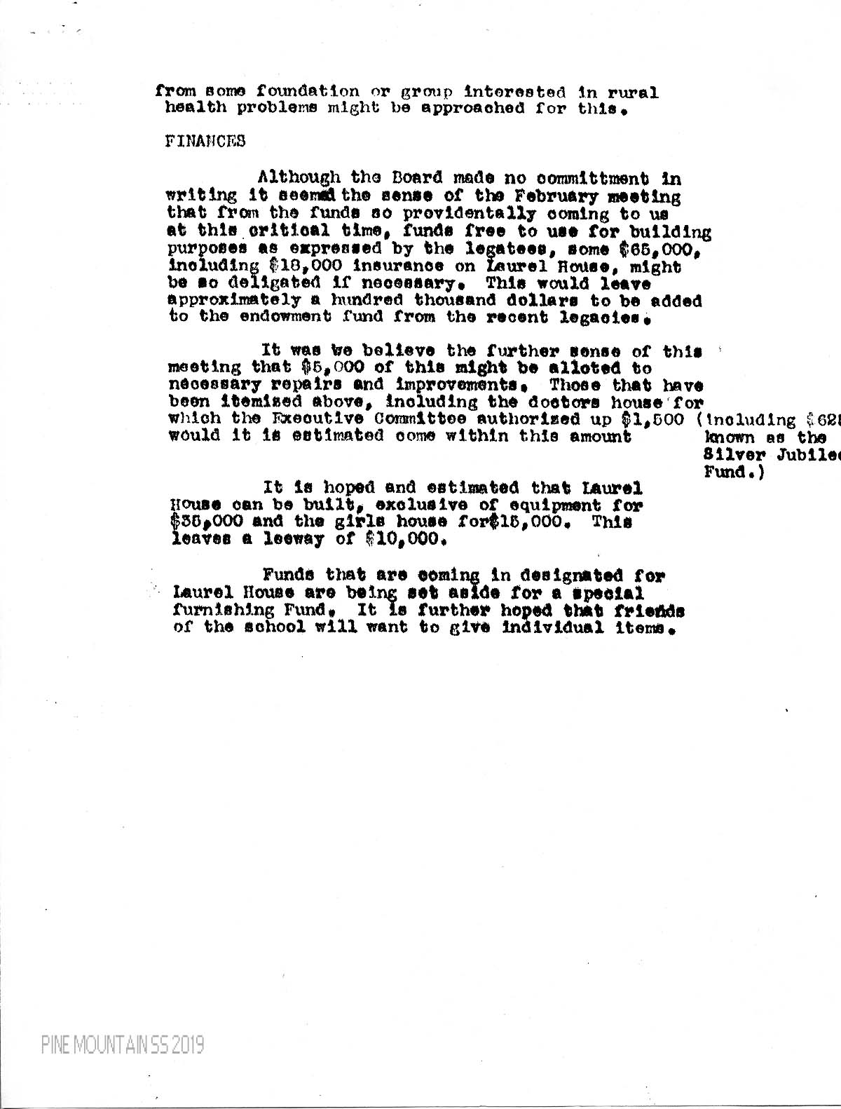 Although the Board made no commitment in writing, it seemed the sense of the February meeting that from the funds so providentially coming to us at this critical time, funds free to use for building purposes, as expressed by the legatees, some $65,000, including $18,000 insurance on Laurel House, might be so delegated if necessary. This would leave approximately a hundred thousand dollars to be added to the endowment fund from the recent legacies.