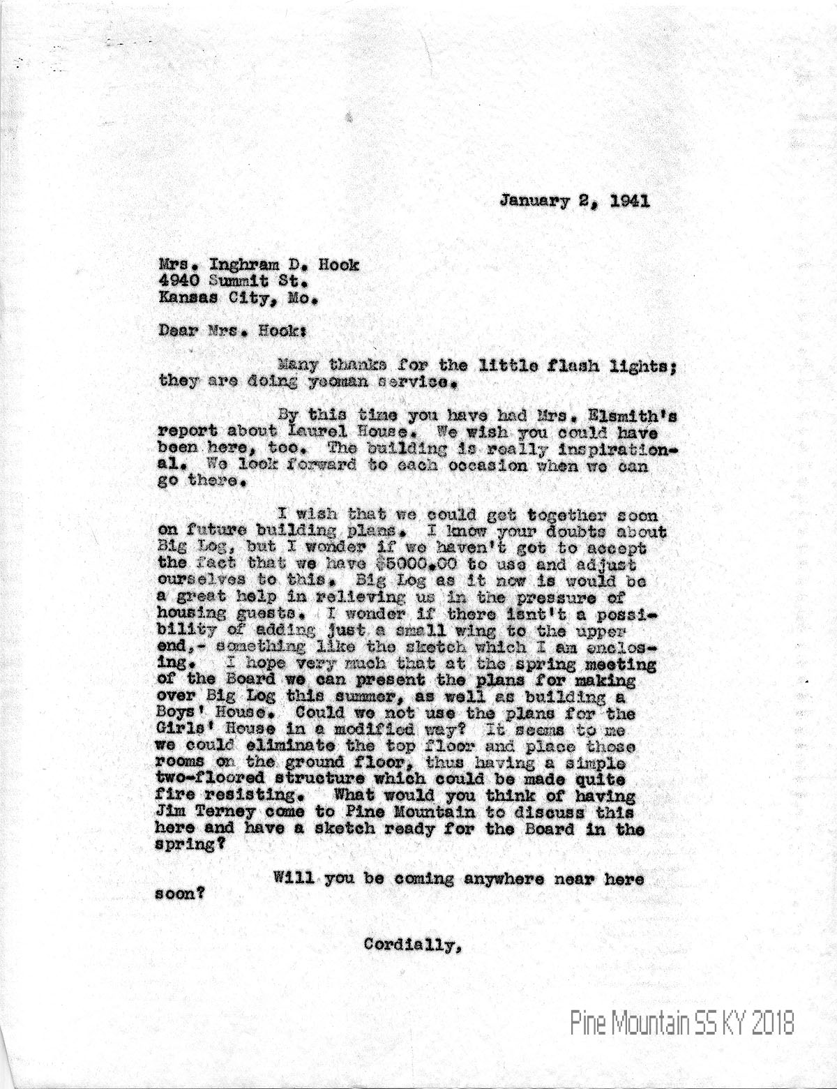 001 January 2, 1941. To Mary Rockwell Hook (Mrs. Inghram D. Hook), Kansas City, MO, from (unsigned, likely Glyn Morris). The School has $5,000 to use and suggests adding a guest wing to Big Log; encloses sketch. Hopes to present plans to the spring Board meeting for making over Big Log and building a Boys’ House. Asks Hook’s opinion about bringing Jim Terney to PMSS to discuss the plans.