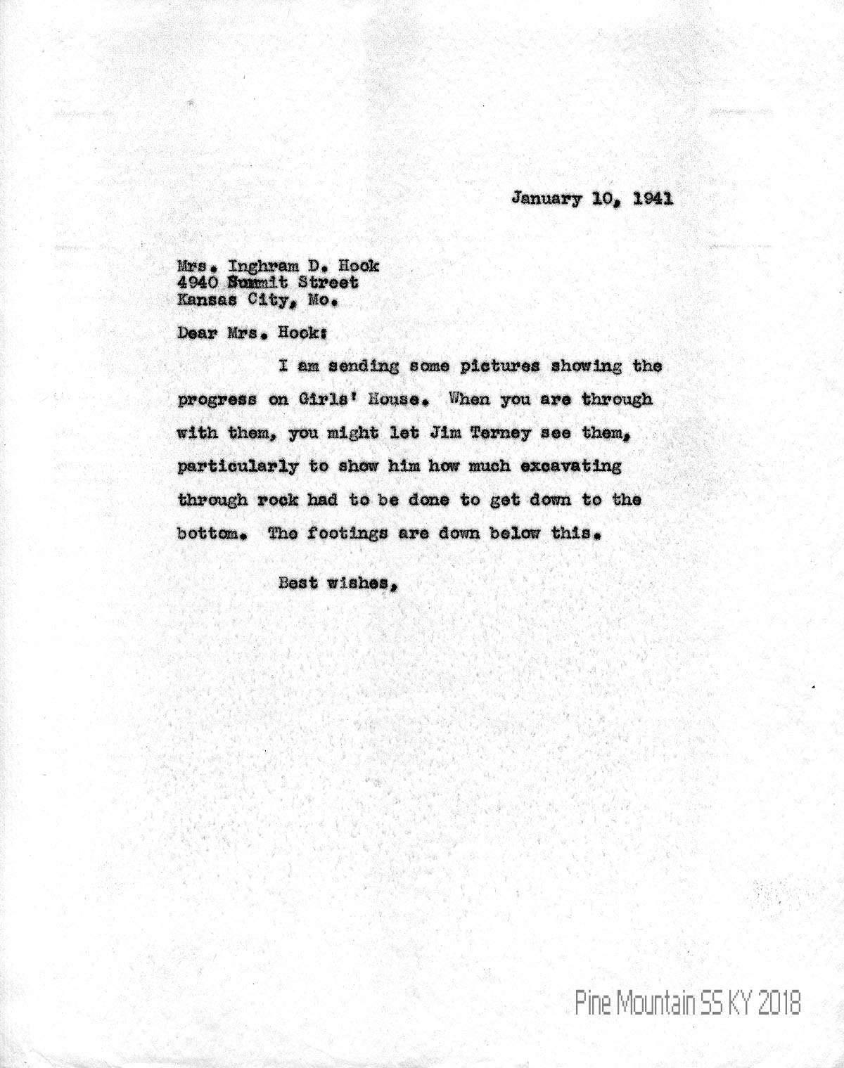 002 January 10, 1941. To Hook from (unsigned, likely Glyn Morris), sending photos of the progress on Girls’ House. Asks her to share them with Jim Terney, showing “how much excavating through rock had to be done to get down to the bottom. The footings are down below this.”