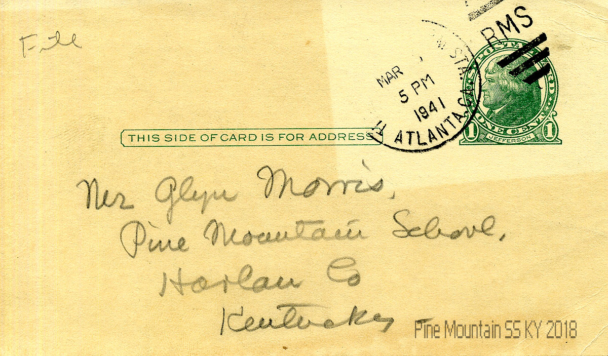 003 March (?), 1941. Address side of postcard to Glyn Morris with postmark from Atlanta, GA.