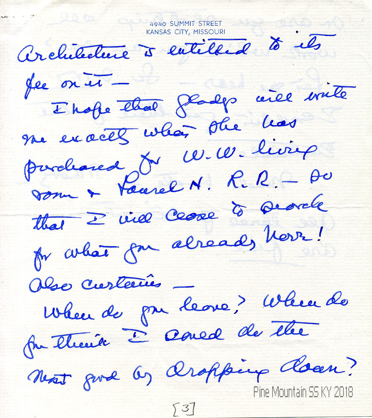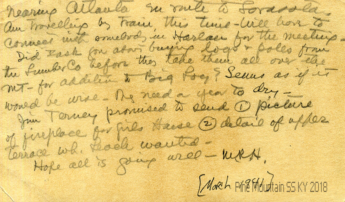 003a N.D. (later notation: “March 1941”) To Morris from M.R.H. (Hook), en route to Sarasota by train. She asks about buying logs and poles for the Big Log addition; “They need a year to dry.” Jim Terney will send a picture of a “fireplace for Girls’ House (and a) detail of the terrace which Leach wanted.”