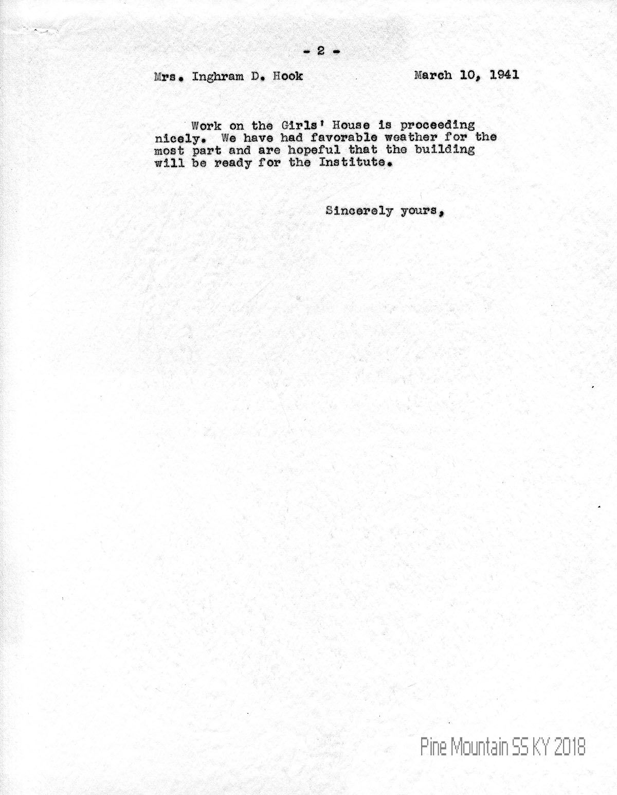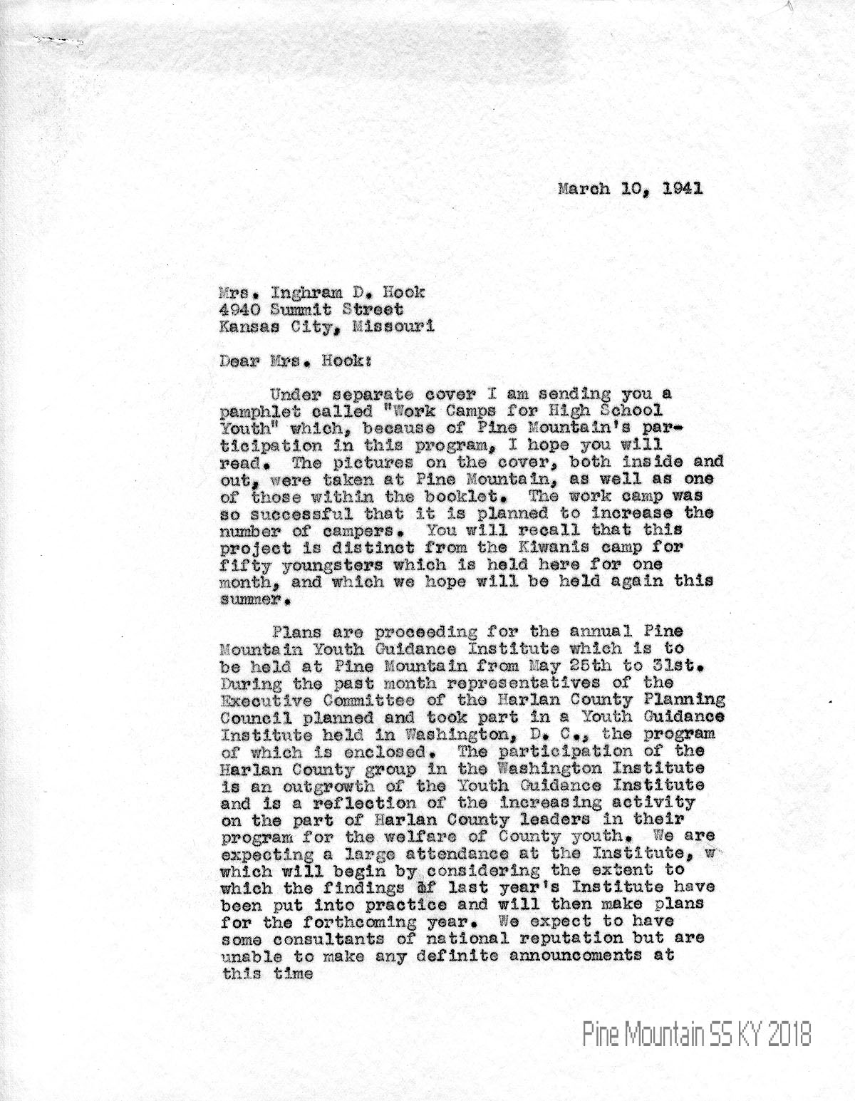 004-004a March 10, 1941. Two-page letter to Hook from (unsigned, likely Morris), who is sending her a pamphlet, “Work Camps for High School Youth” in which PMSS participates; includes PMSS photographs. He reminds her that “this project is distinct from the Kiwanis camp for fifty youngsters which is held here for one month….” Tells about plans for the annual Pine Mountain Youth Guidance Institute in May; and the Harlan County Planning Council’s participation in a Youth Guidance Institute held in Washington, D.C. He hopes that the Girls’ House construction will be completed for the Institute meeting.