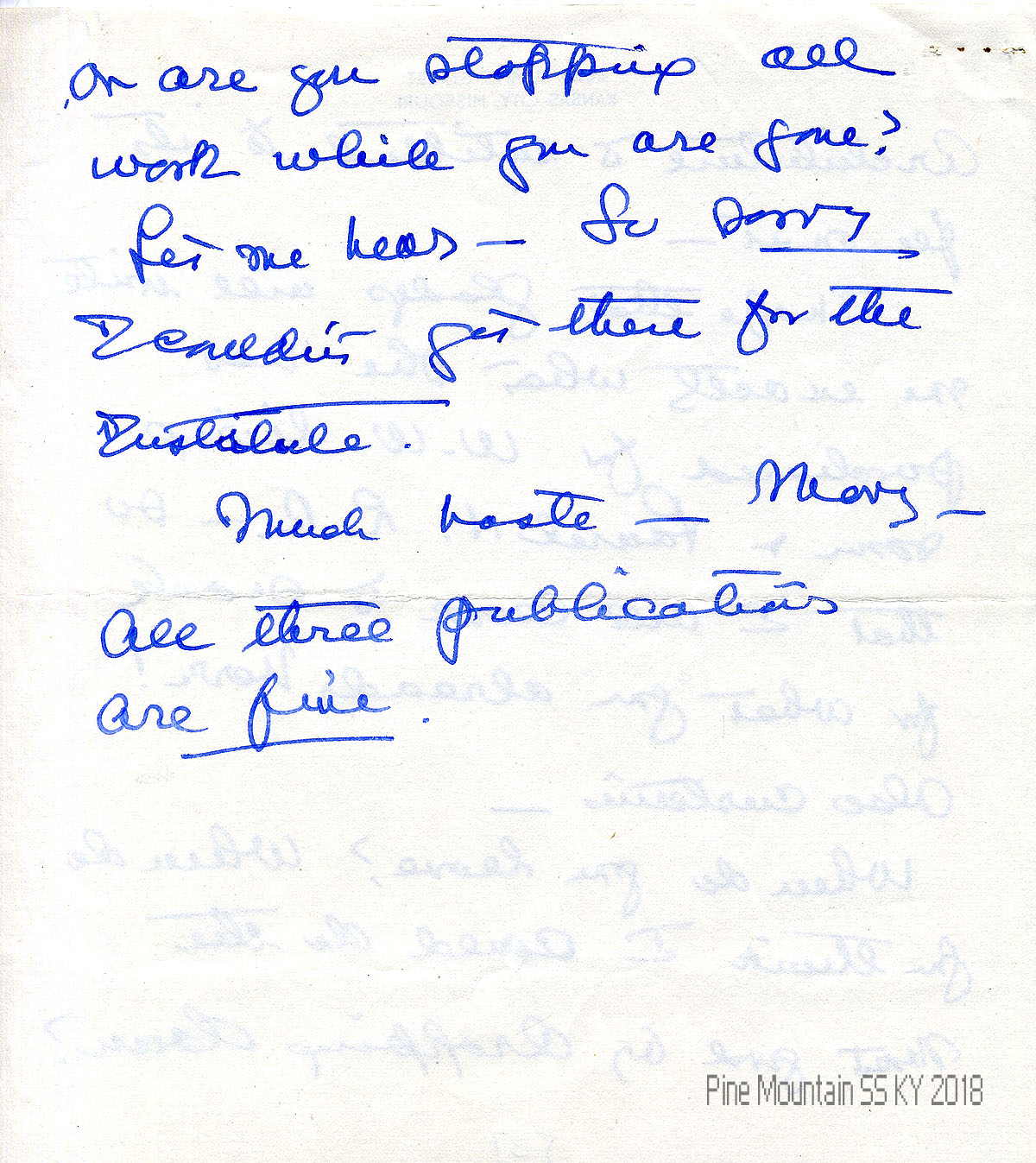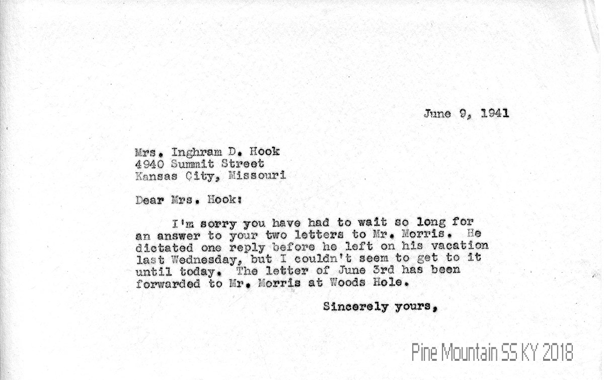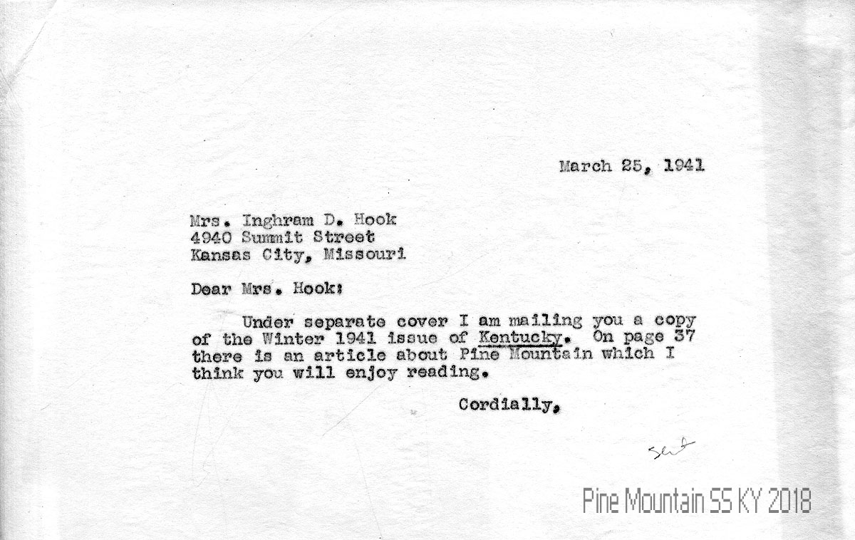 005 March 25, 1941. To Hook from (unsigned, likely Morris), who is sending her a copy of the Winter 1941 Kentucky with an article about Pine Mountain.