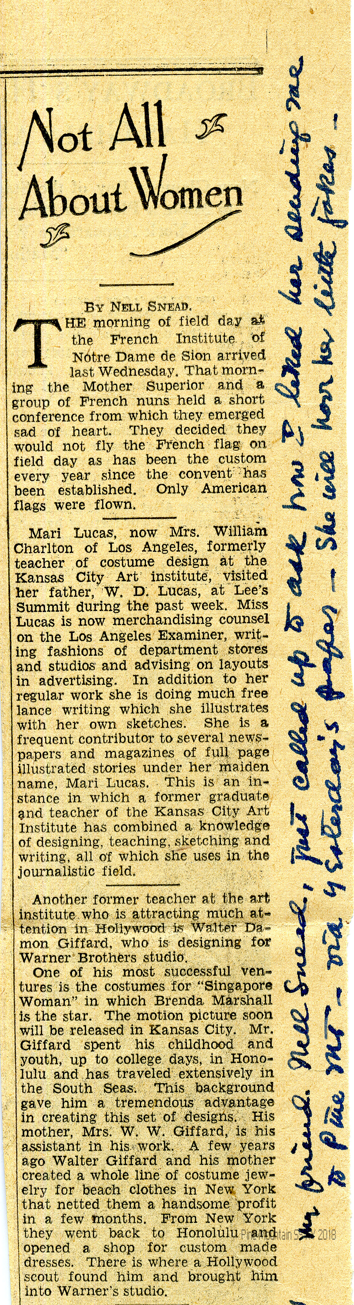 006-006a N.D. Newspaper clipping titled “Not All About Women” by Nell Snead. It includes a paragraph about Mrs. Hook’s architectural work at PMSS and the dedication of the new girls’ dormitory at which Mrs. Franklin D. Roosevelt will speak.