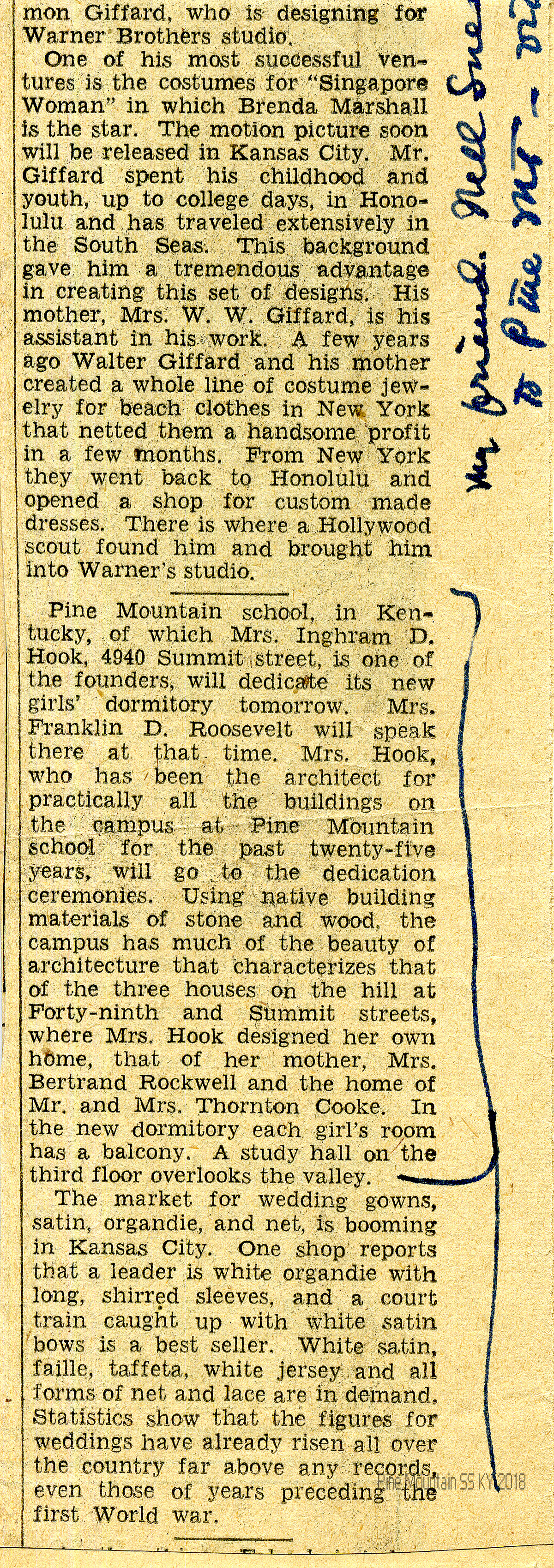 Notation in Hook’s handwriting in margin: “My friend, Nell Snead, just called up to ask how I liked her sending me to Pine Mt, via yesterday’s paper. She will have her little jokes.”