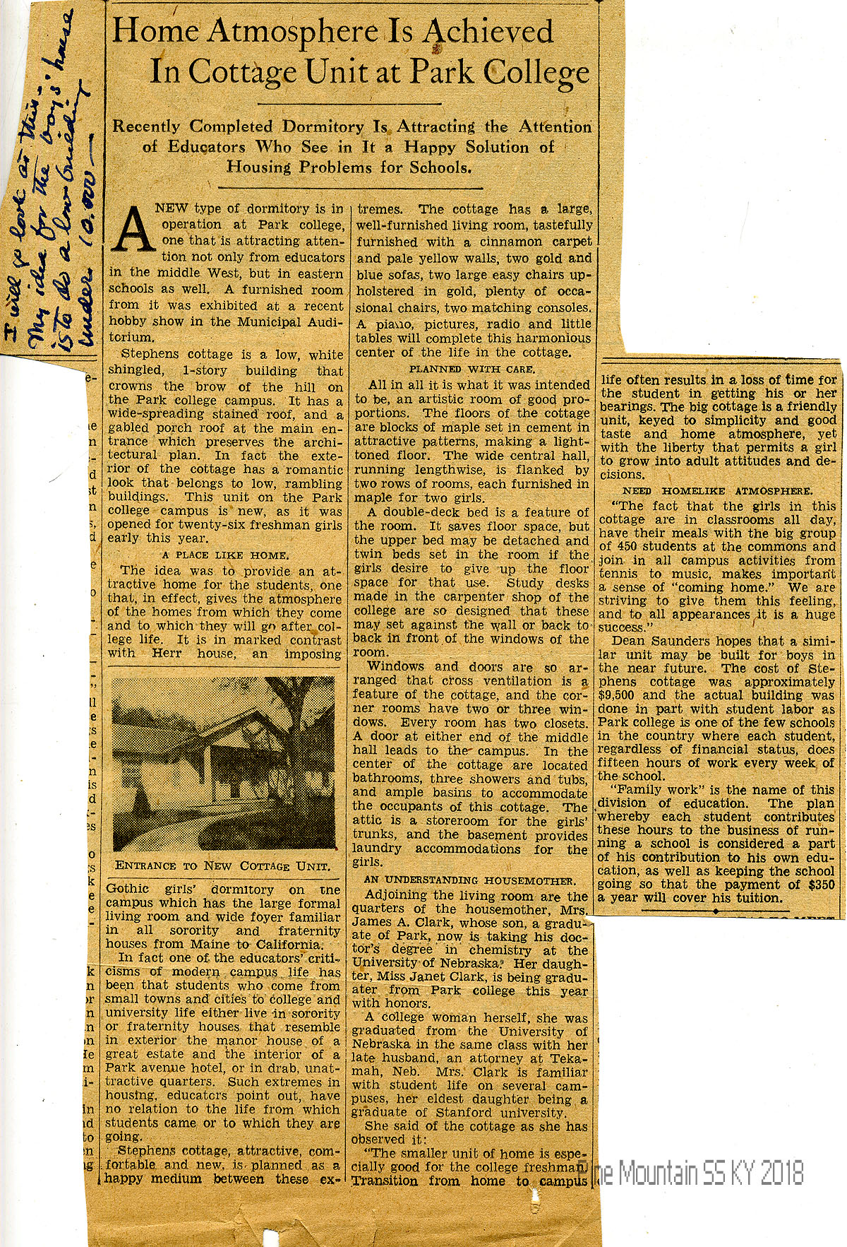 007 N.D. Newspaper clipping titled “Home Atmosphere Is Achieved in Cottage Unit at Park College. Recently Completed Dormitory Is Attracting the Attention of Educators Who See in It a Happy Solution of Housing Problems for Schools.” Hook’s notation in margin: “I will go look at this. My idea for the boys’ house is to do a low(?) building under 10,0000.”