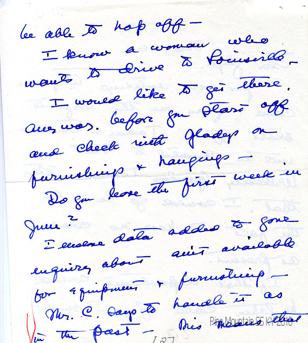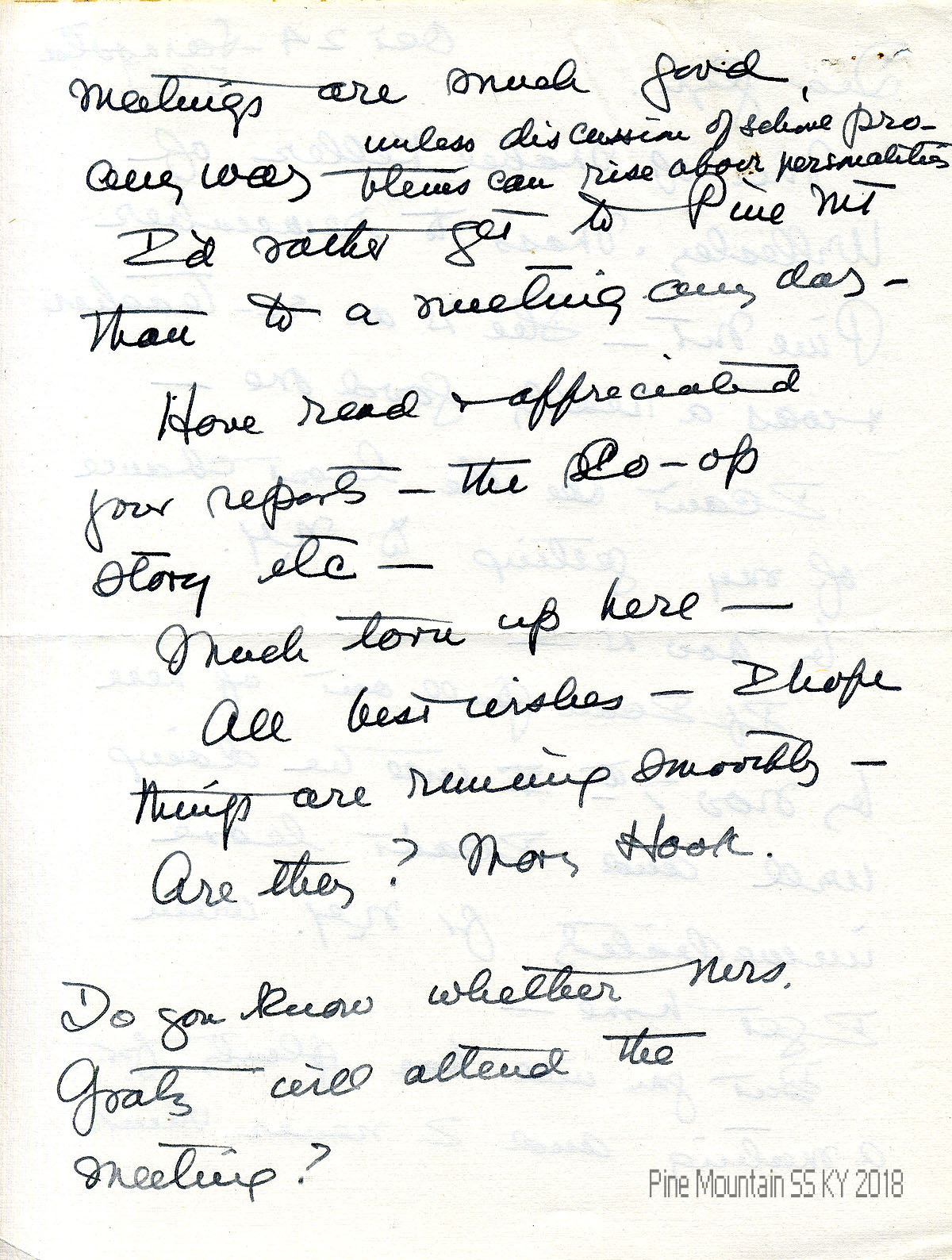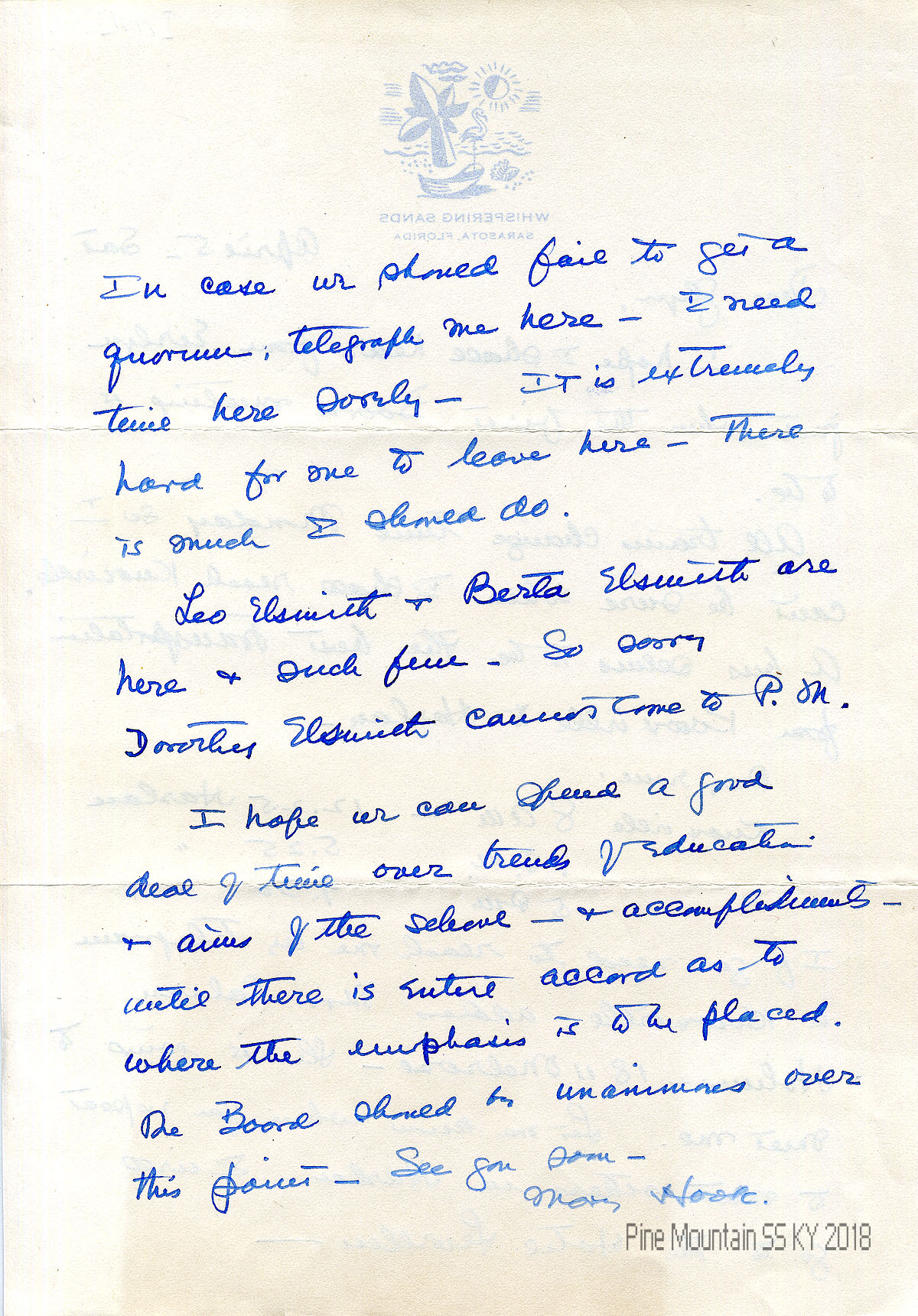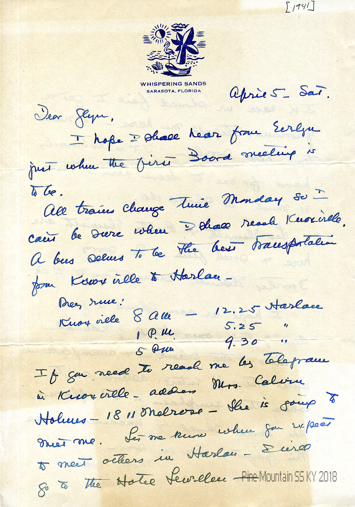 008-009 April 5, (no year). Two-page letter to “Glyn” from Hook in Sarasota, FL, telling her travel plans to the board meeting by bus from Knoxville to Harlan; and how to contact her in Knoxville. She hopes the Board can come to unanimous agreement over “trends of education and aims of the school & accomplishments….”