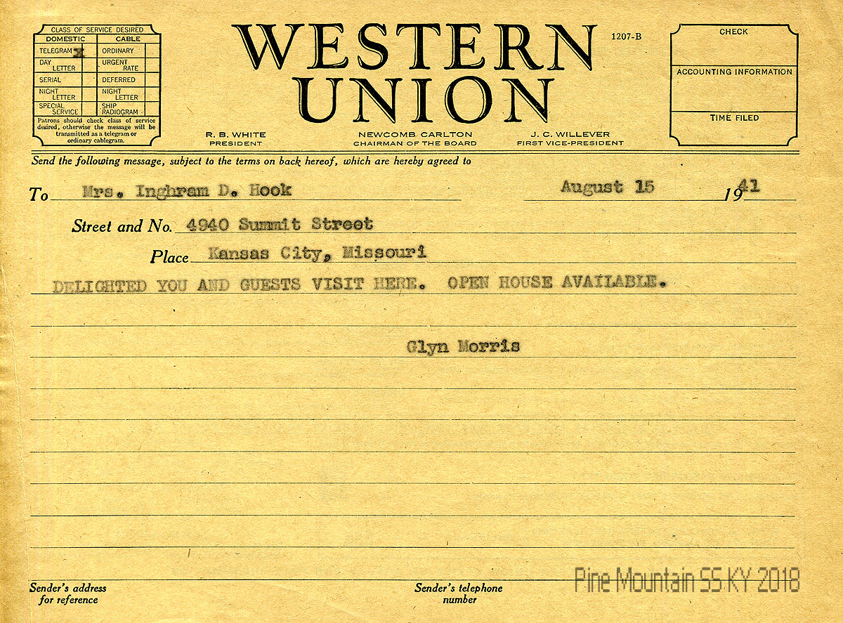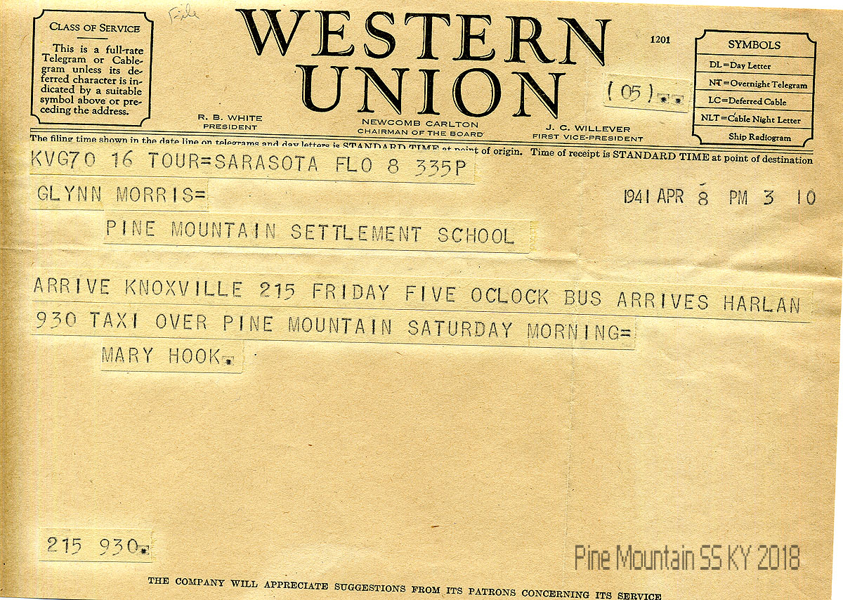 010 April 8, 1941. Western Union telegram to Morris from Hook, who will arrive in Knoxville on Friday, take a bus to Harlan, then taxi over Pine Mountain on Saturday.