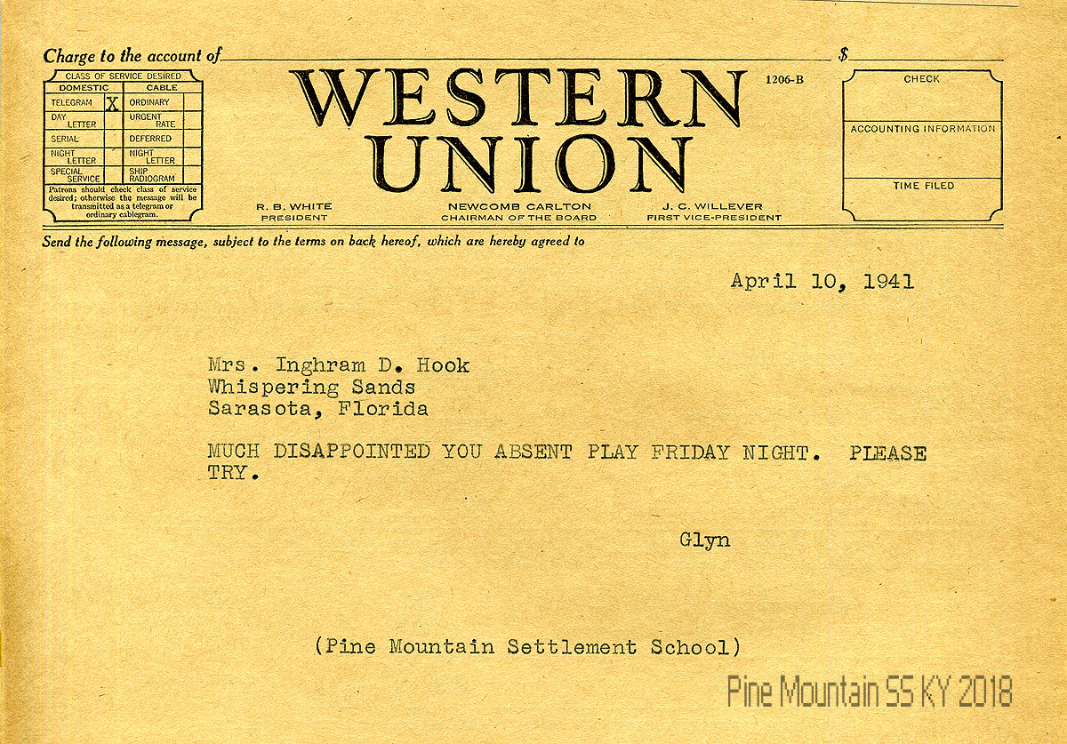 011 April 10, 1941. Western Union telegram to Hook in Sarasota, FL, from Morris, regretting she missed the play.