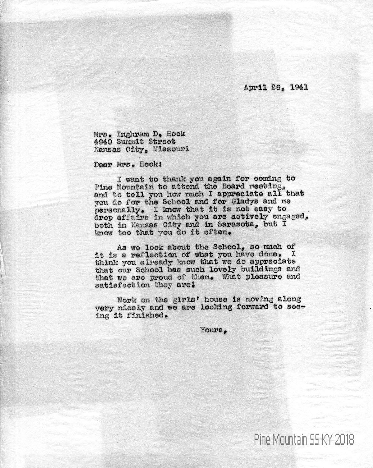 012 April 26, 1941. To Hook from (unsigned, likely Morris), thanking her for attending the Board meeting at PMSS and “all that you do for the School and for Gladys and me personally. … As we look about the School, so much of it is a reflection of what you have done. …[We] appreciate that our School has such lovely buildings and that we are proud of them….”