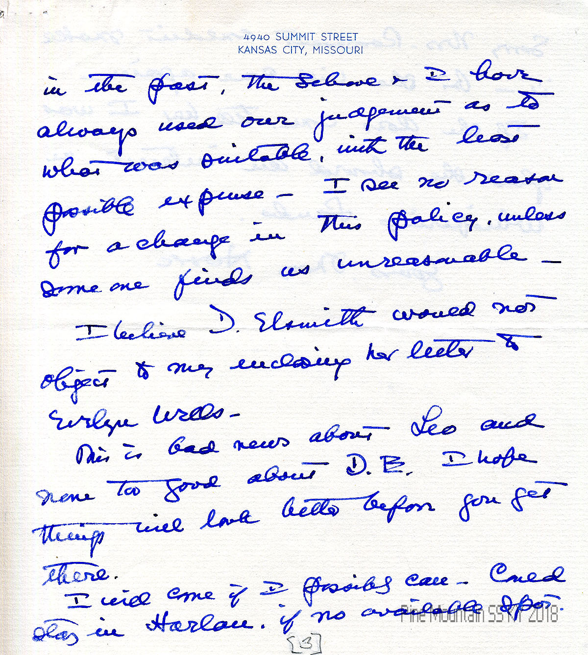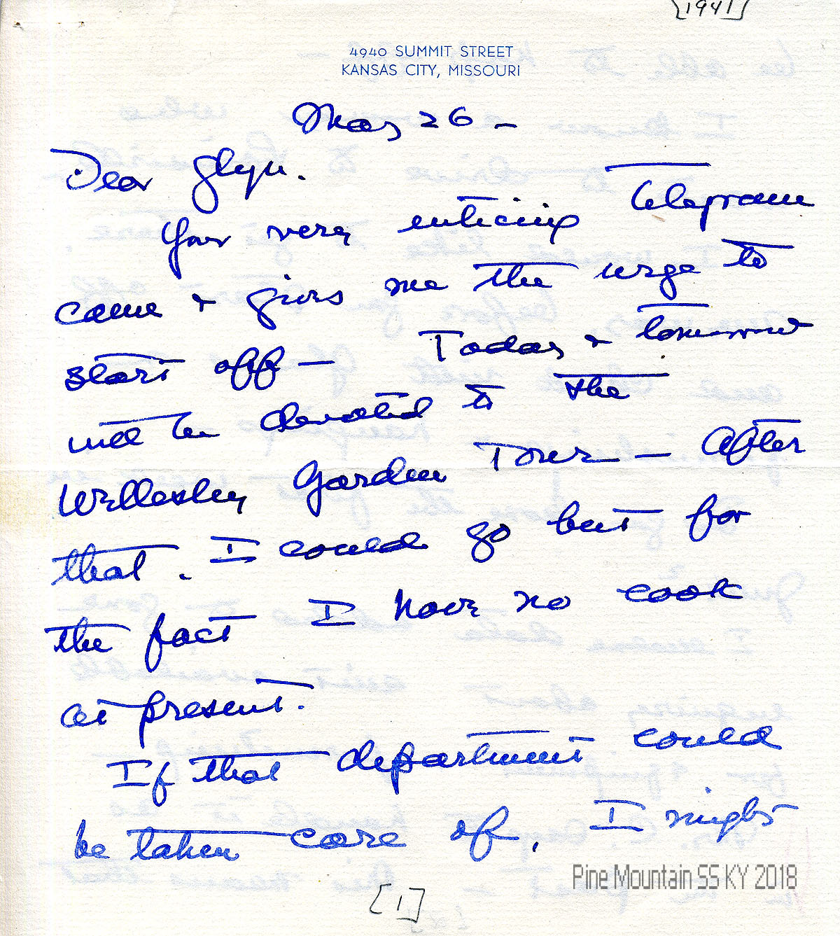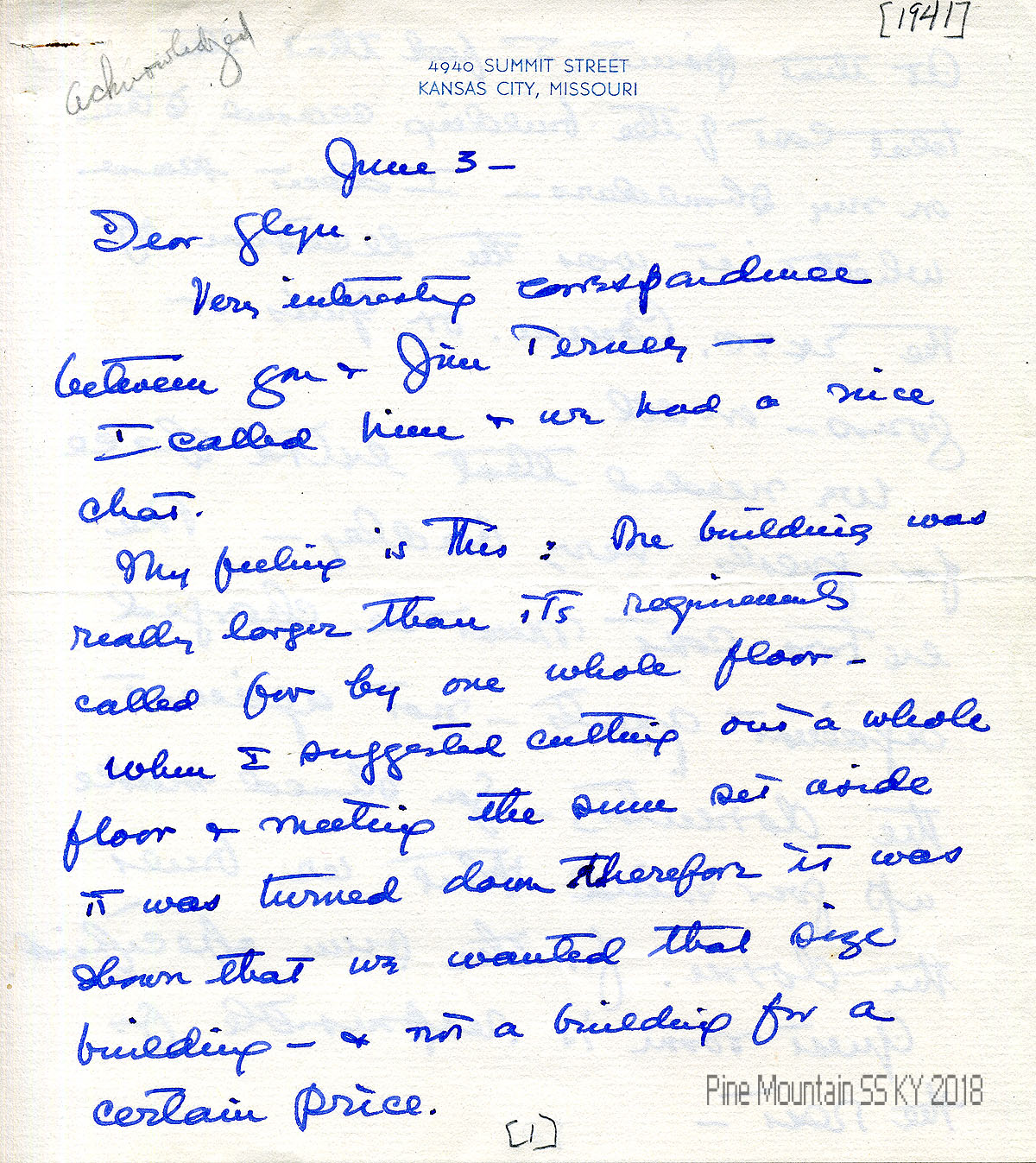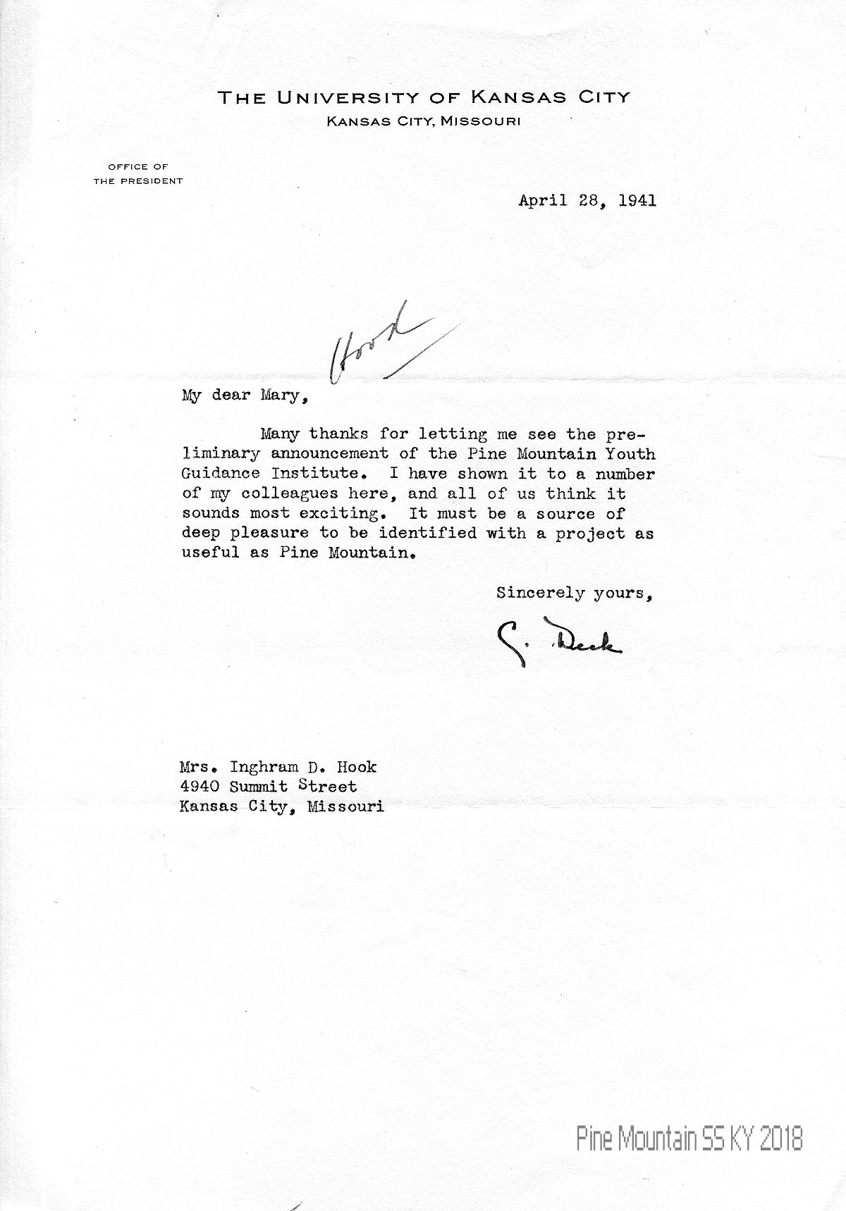 013 April 28 1941. To “Mary” (Hook) in Kansas City, MO, from C. Dick, Office of the President, The University of Kansas City, thanking her for sharing the “preliminary announcement of the Pine Mountain Youth Guidance Institute.”