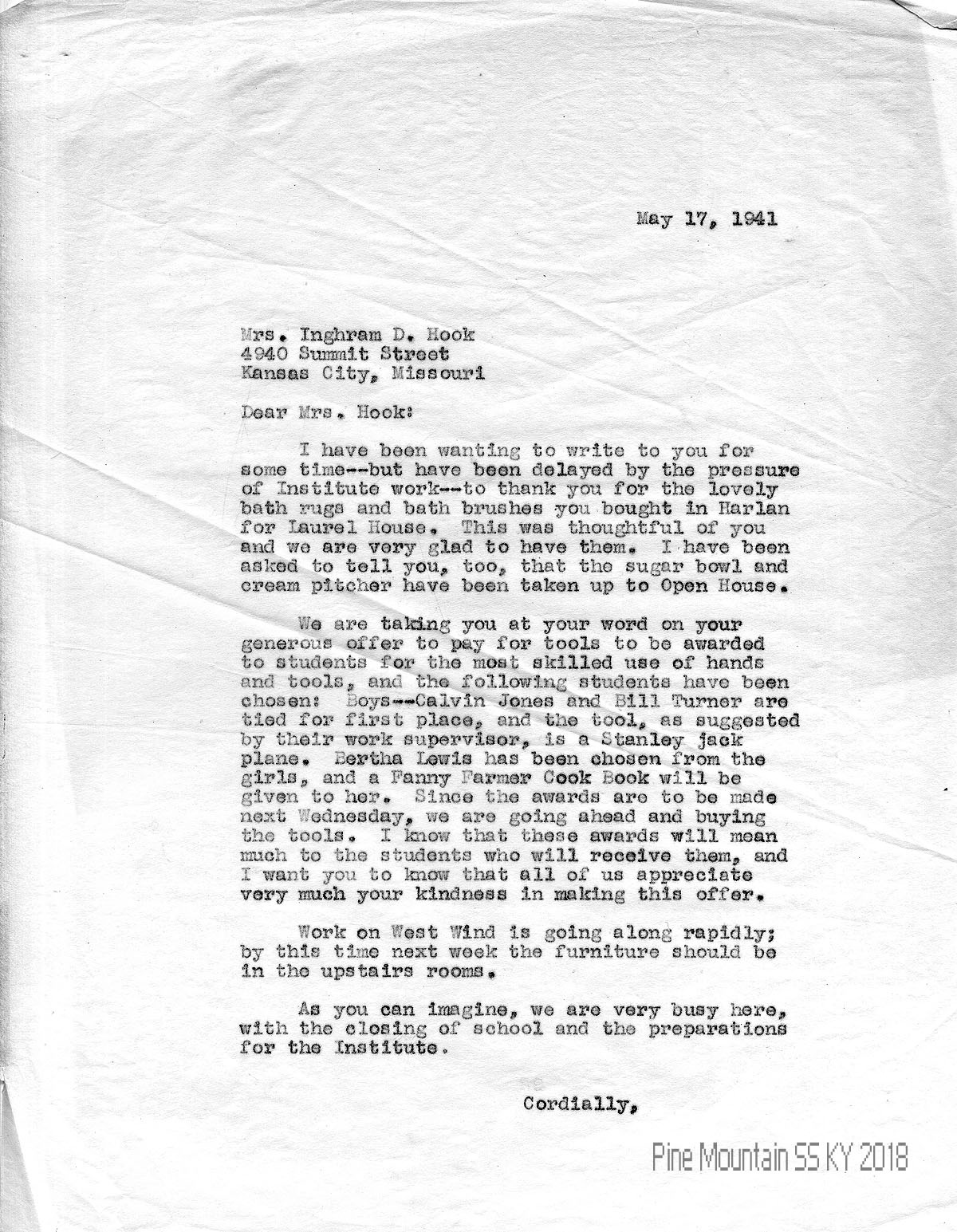 014 May 17, 1941. To Hook from (unsigned, likely Morris), thanking for bath rugs and brushes for Laurel House. Hook has offered “to pay for tools to be awarded to students for the most skilled use of hands and tools.” He names the students: Calvin Jones and Bill Turner (Stanley jack plane); Bertha Lewis (Fannie Farmer Cookbook). “Work on West Wind is going along rapidly….”