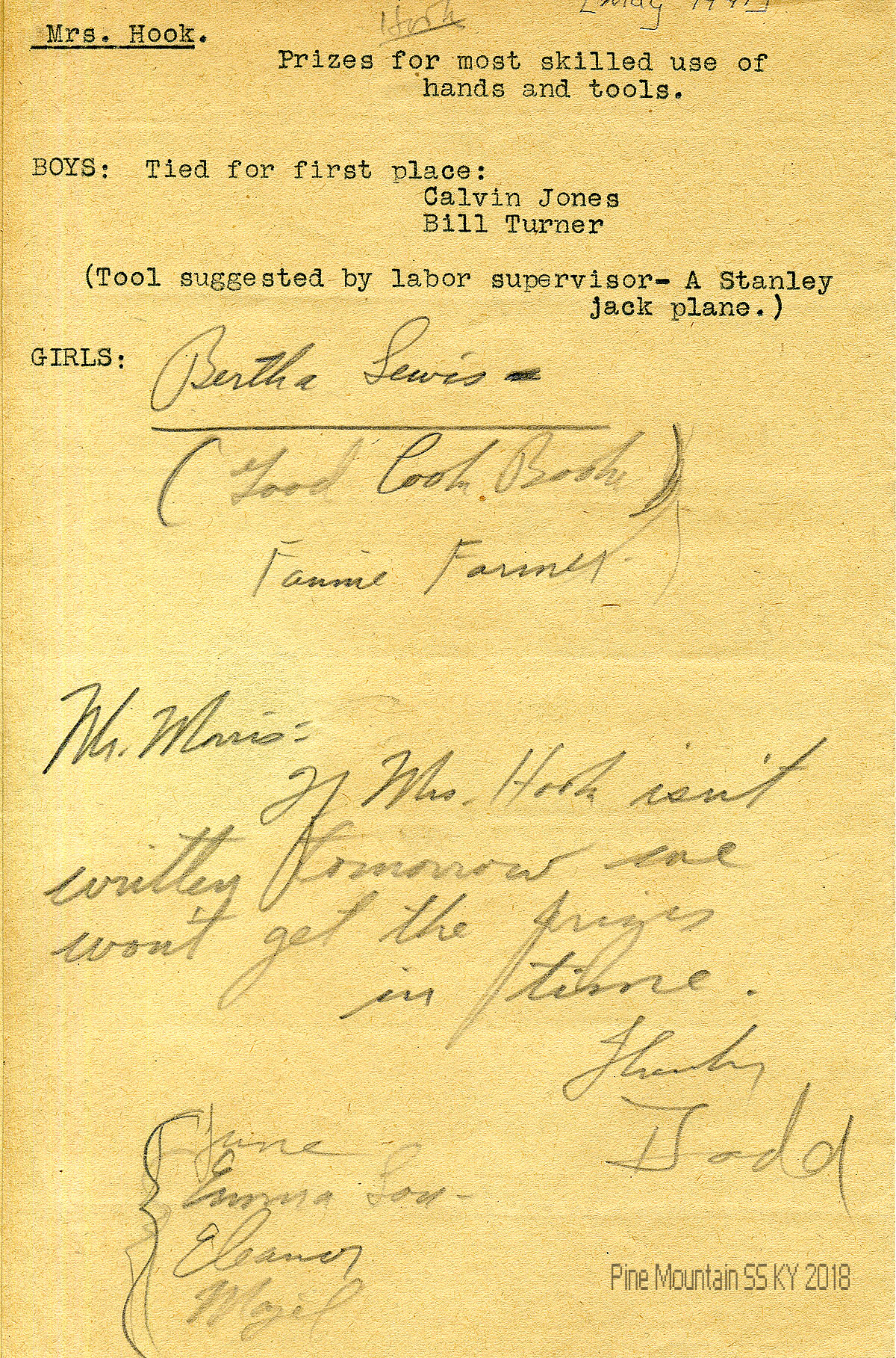 015 N.D. (Later notation: May 1941”) A handwritten note from (Arthur) Dodd to Morris, with list of winners and the tools, and reminding him to ask Mrs. Hook to send the prizes.