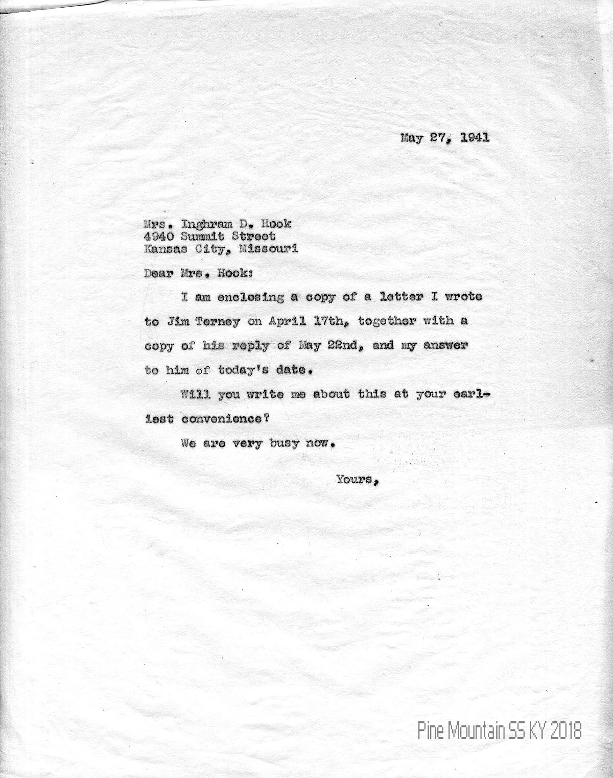 018 May 27, 1941. To Hook from (unsigned, likely Morris), enclosing letters between him and Jim Terney and asking for her response.