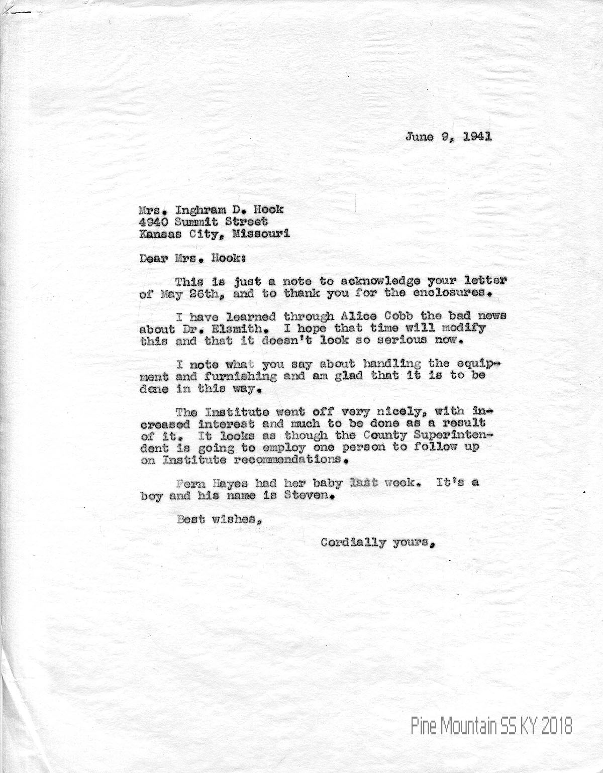 021 June 9, 1941. To Hook from (unsigned), acknowledging her May 26 letter and enclosures. Mentions the success of the Institute. “Fern (Hall) Hayes had her baby last week. It’s a boy and his name is Steven.”