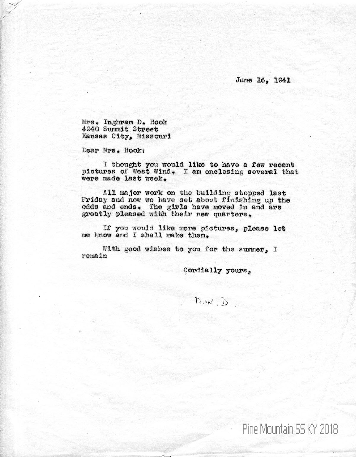022 June 16, 1941. To Hook from “A.W.D.” (Arthur W. Dodd, enclosing photos of West Wind, which is just being finished up. “The girls have moved in and are greatly pleased with their new quarters.”